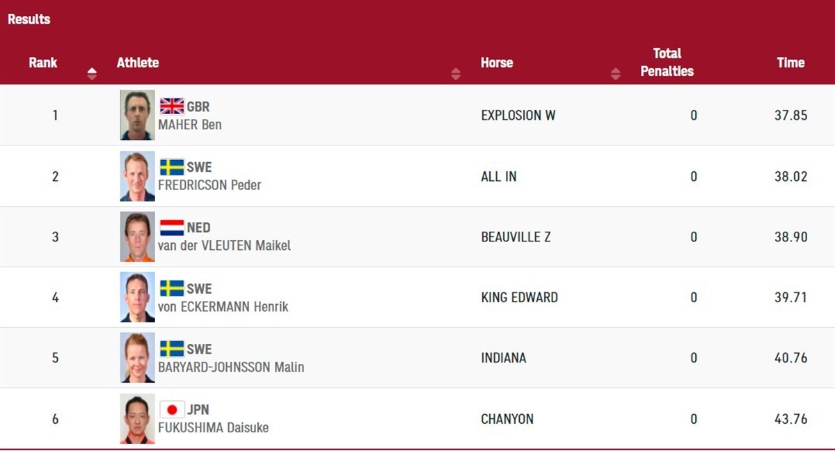 Med i omspringningen var ligeledes svenske Henrik von Eckermann, svenske Malin Baryard-Johnsson og japanske Daisuke Fukushima, som også alle red fejlfrit.