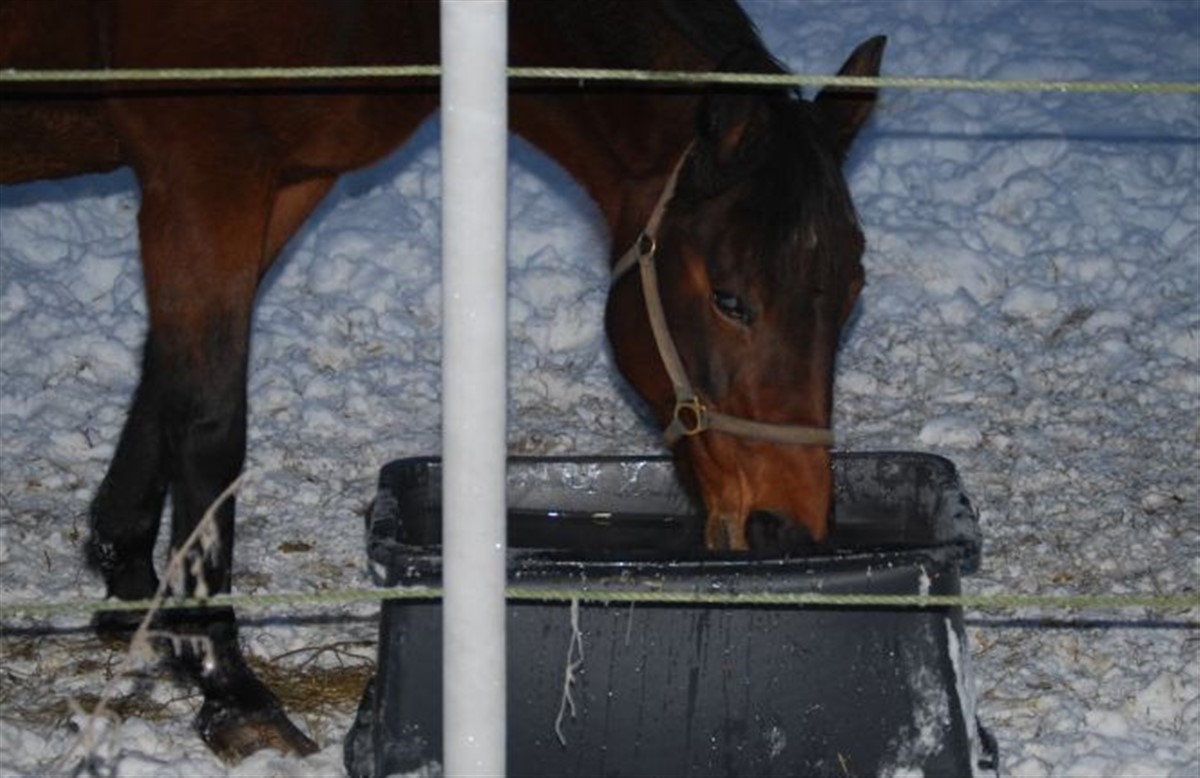 En bruger af Ridehesten.com skriver: Alle har råd til denne løsning: Køb 2 almindelige baljer i 2 størrelser efter hinanden. evt. 90 og 120 l. Man skærer bunden ud af den store, og i hullet placerer du den balje nummeret mindre. Hulrummet mellem baljerne skal fores med halm. De blev fyldt med vand tirsdag formiddag, og torsdag morgen efter en nat med -17 grader var der kun et tyndt lag is, jeg kunne slå væk med karabinhagen fra træktoret. SÅ DET VIRKER !!!