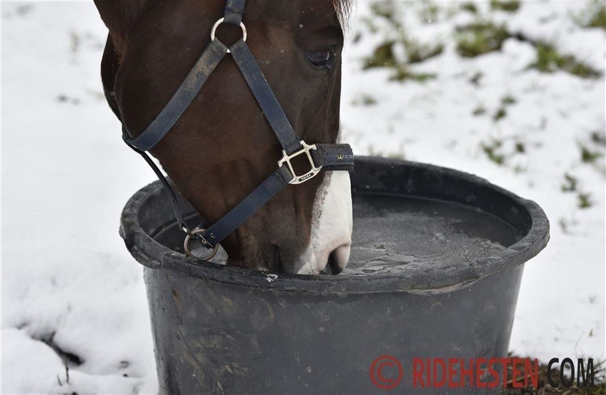 - Hæld varmt vand i drikketruget: Hvis du er så heldig at have adgang til en varmtvandshane, så er det en god idé at spæde det kolde vand op med en spandfuld varmt vand, selvom du nok må indse, at du skal give mere vand, end du plejer for at holde temperaturen. Lidt varmt vand kan desuden opmuntre hesten til at drikke.