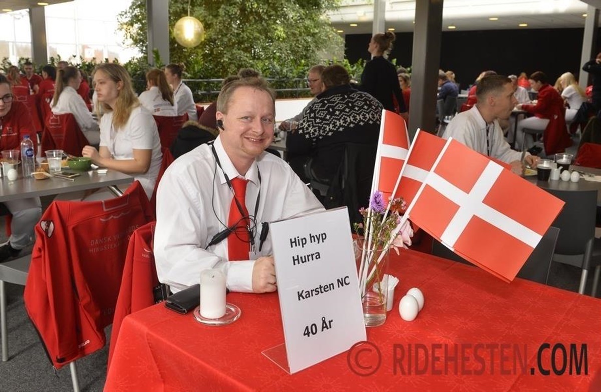 Karsten fylder 40 år i dag, og har ikke noget imod at skulle fejre sin fødselsdag, her under Herning Horse Show. Hans søde kone Iris havde i morges dækket op til fest oppe i DV lokalerne, hvor alle de frivillige kommer og får mad. I aften står den så på gallashow, hvor vi må håbe at Karsten også får at føle, at gallaen er en lille smule til ære for ham og hans trofaste arbejde.