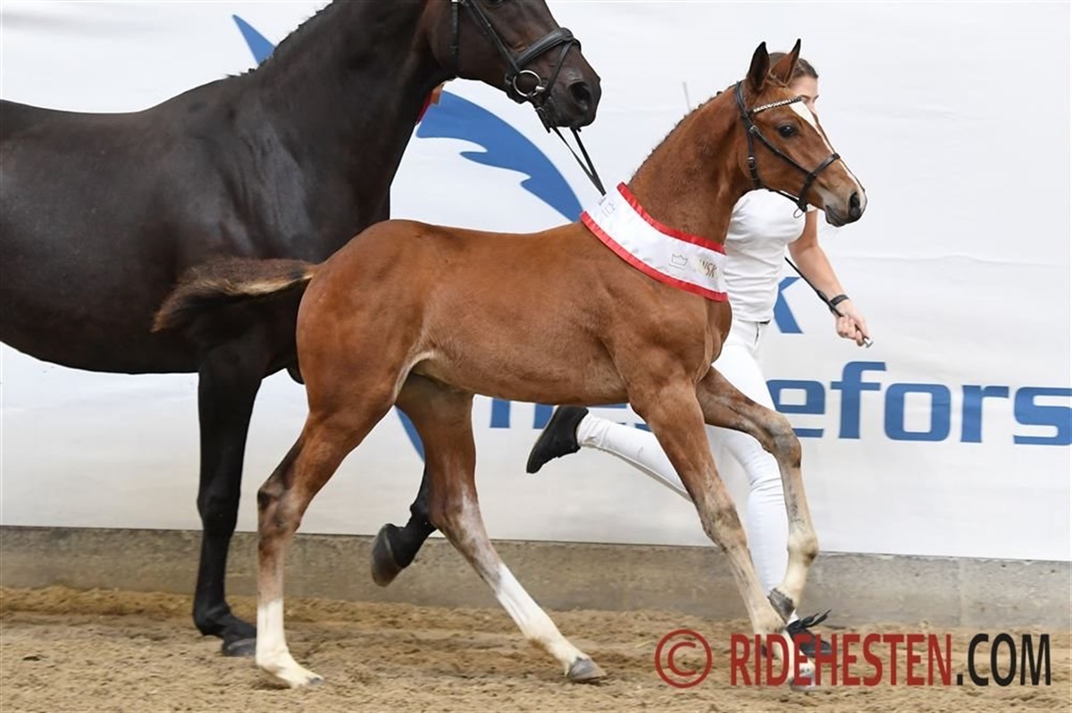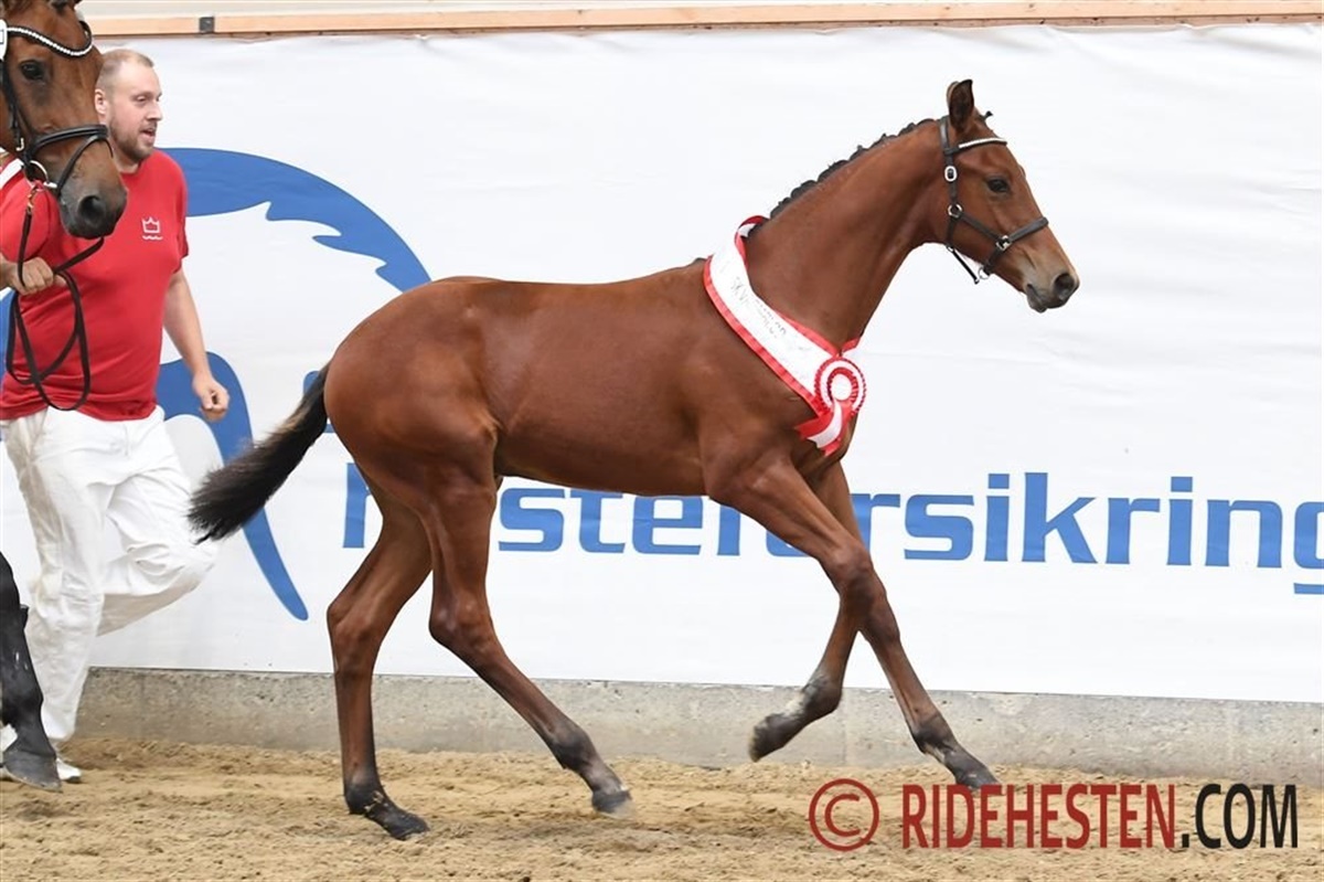 – Det er et dejligt og højtstillet hoppeføl med masser af kønspræg. Føllet er en rigtig god type og hun har en meget ensartet og energisk galop.