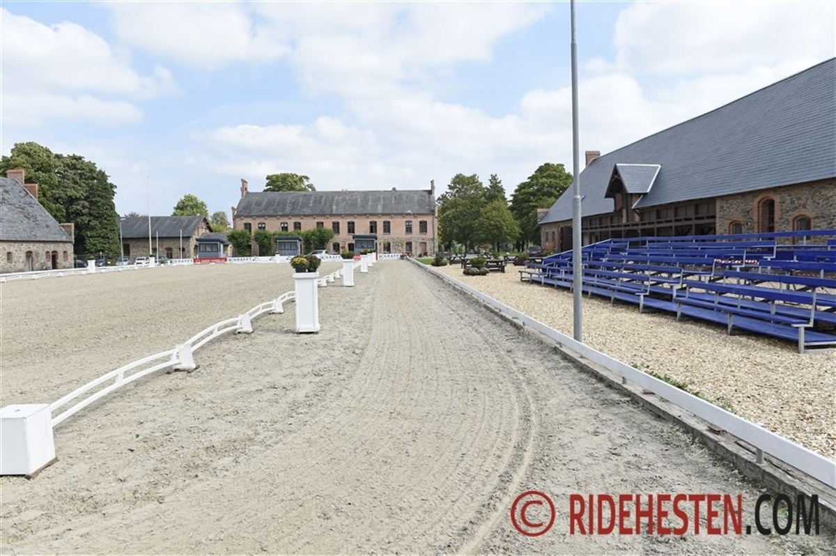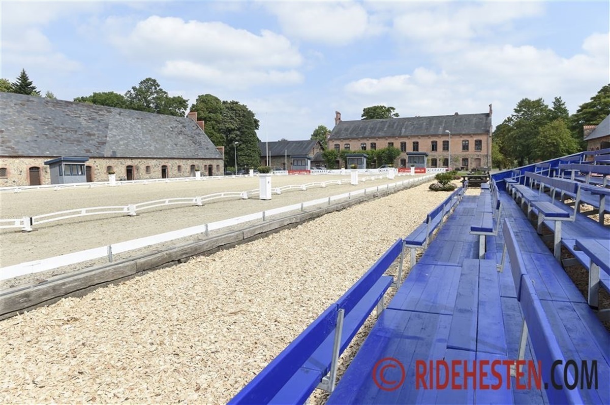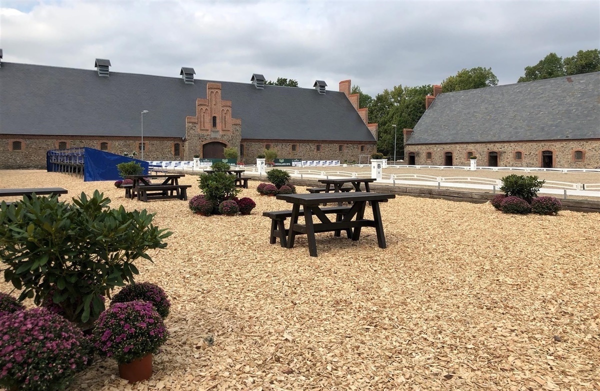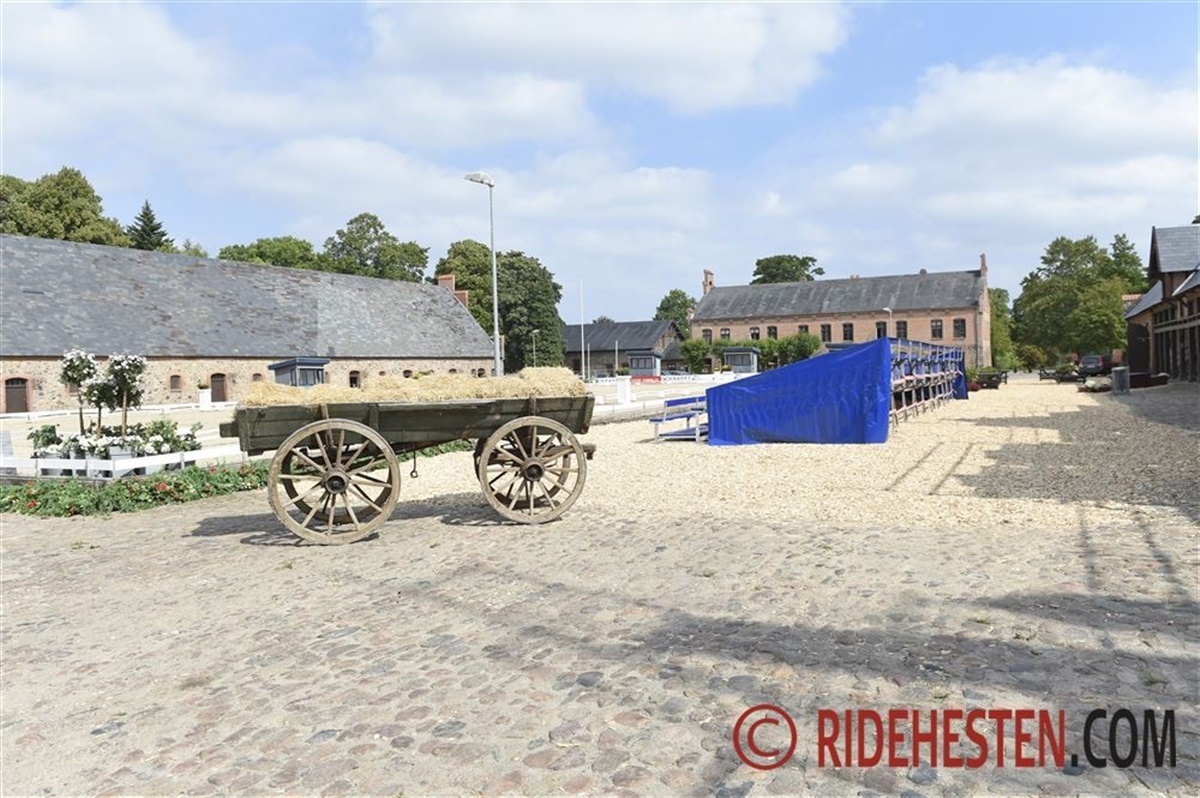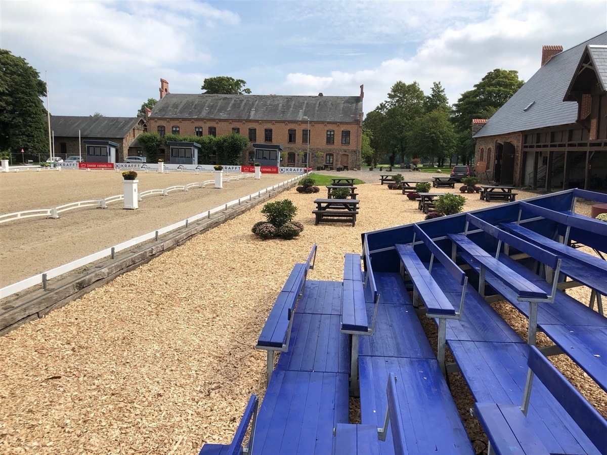 Gårdspladsen danner en fantastisk, hyggelig ramme omkring afviklingen af dressurkonkurrencerne. Som vi oplevede det ved bl.a. EM for ponyer, kan pladsen virkelig gøres intim og smuk. Denne weekend har arrangørerne igen lavet en smuk opsætning på gårdspladsen, hvor der er opsat tribuner og sat bord/bænke-sæt op omkring banen.