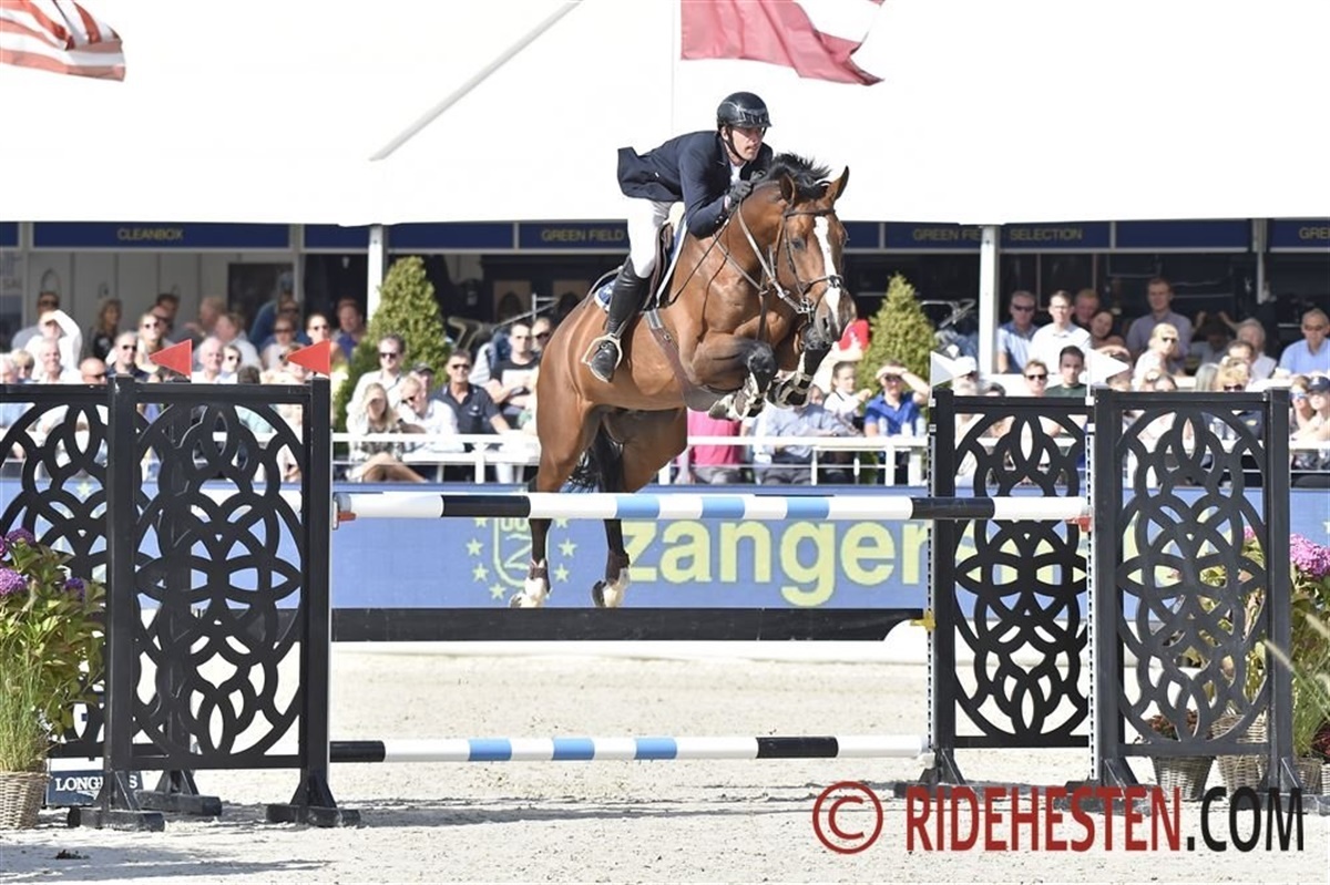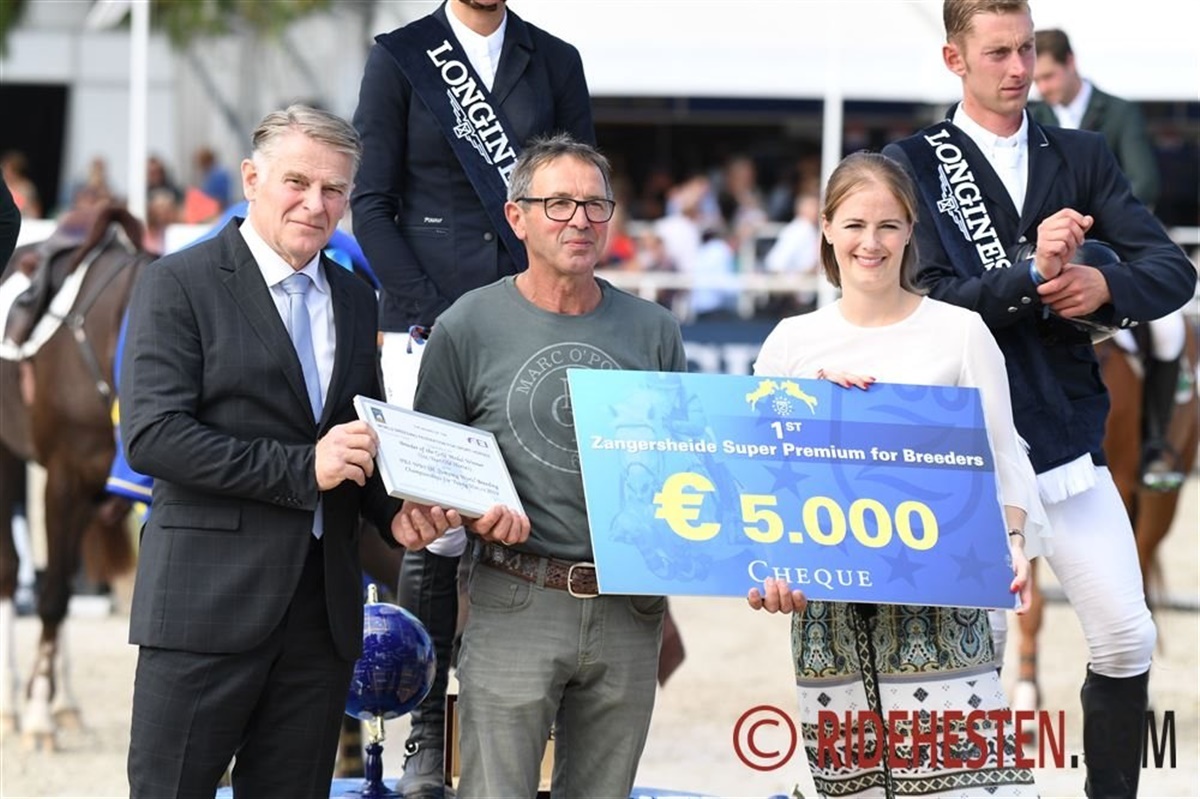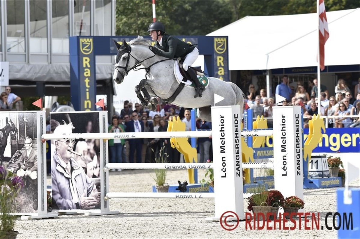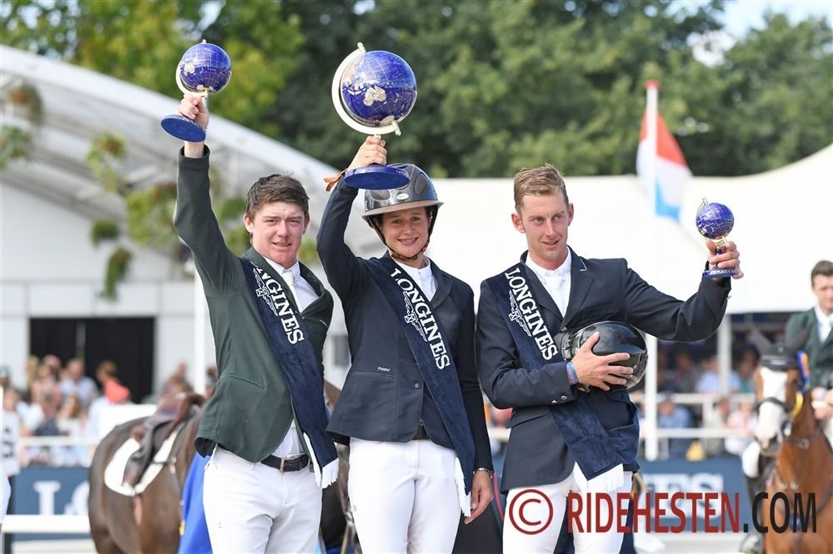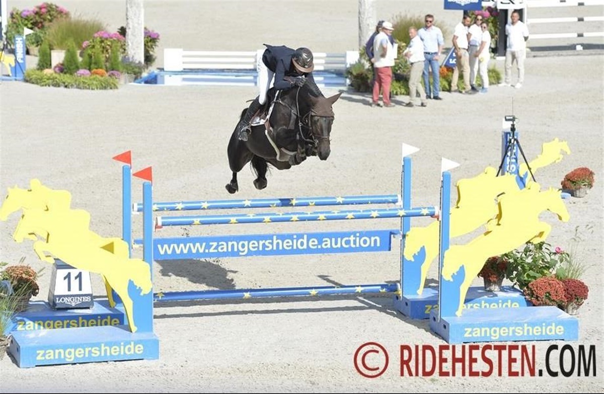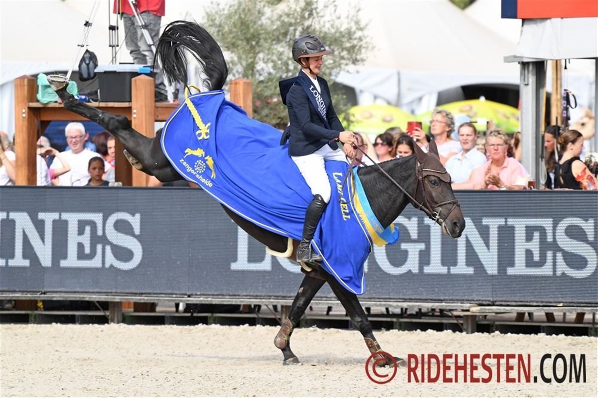 Katrin Eckermann red en drømmerunde med Chao Lee e. Comme Il Faut/Chacco-Blue reg. i RHEIN opdrættet af hende far Otmar Eckermann, den 6-årige hoppe sprang uimponeret i stort tempo med lynhurtige reaktioner og stor forsigtighed. Katrin stoppede tiden på 40,64 sekunder, og så var det op til omspringningens sidste rytter Michael Pender fra Irland at ride guldmedaljen hjem. I finalen for 5-års heste havde han vundet sølv, og han havde to heste med i omspringningen. Med den første fik han 8 fejl, men med MHS Cardenta e. Cardento/Diamond Serpent (ISH) lagde han op i et godt tempo, og så så han sig ikke tilbage. Et efter et blev forhindringerne overvundet, også dobbeltspringet med efterfølgende lodret, som havde knust medaljedrømmene for mange i omspringningen. Publikum red med ham mod sidste spring (se video) men han standsede tiden 0,1 sekund langsommere end den tyske rytterske.