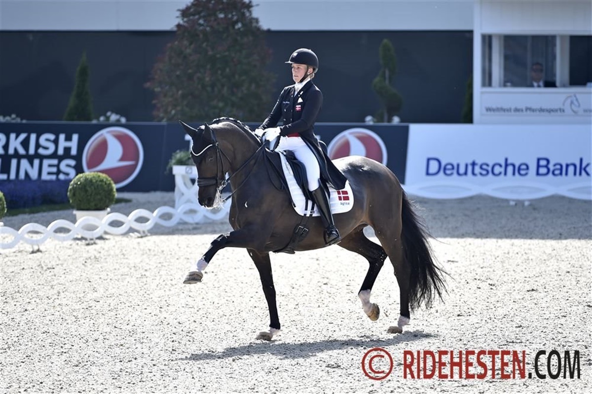 Første danske rytter på banen var Nanna Skodborg Merrald med 17-årige Atterupgaards Orthilia e. Gribaldi/ Donnarschlag (opdr. Kristine Munch Nielsen), og de lagde rigtig godt ud med et velredet program, hvor hoppen konstant var fokuseret på opgaven. I den sidste travøgning sprang Orthilia desværre i galop, men en god midterlinje til sidst sikrede dem 73,34% og lige nu en foreløbig tredjeplads.