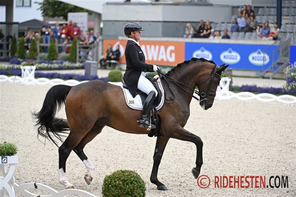 Lone Bang Zindorff og Thranegaardens Rostov e. Blue Hors Romanov/ Diamond (opdr. Jens Riishede Jensen) var også til start i Aachen sidste år, hvor de deltog i CDI4*. I år har ekvipagen fået en plads på det danske dressurlandshold i Nations Cuppen og her var Lone og Rostov de første til at repræsentere Danmark. Den 13-årige hoppe så veltilpas ud under Lone og langt hen af vejen så det rigtig godt ud for ekvipagen. Flotte momenter i passagen, men med lidt for fremadgående piaff, blev det ikke til de helt store karakterer fra dommerne. I galopprogrammet startede ekvipagen godt ud med flotte toer changementer, mens der desværre fulgte en fejl i slutningen af etterne. Samlet endte de med 69,78% og det gør at de på nuværende tidspunkt ligger nummer 13 i klassen.
