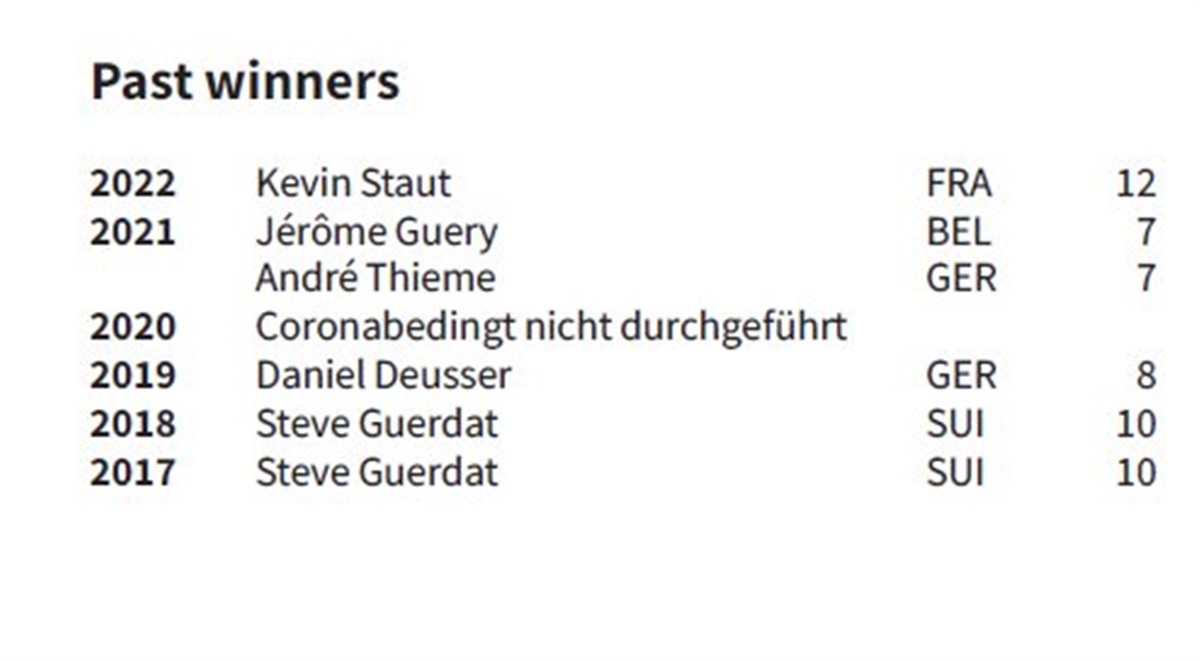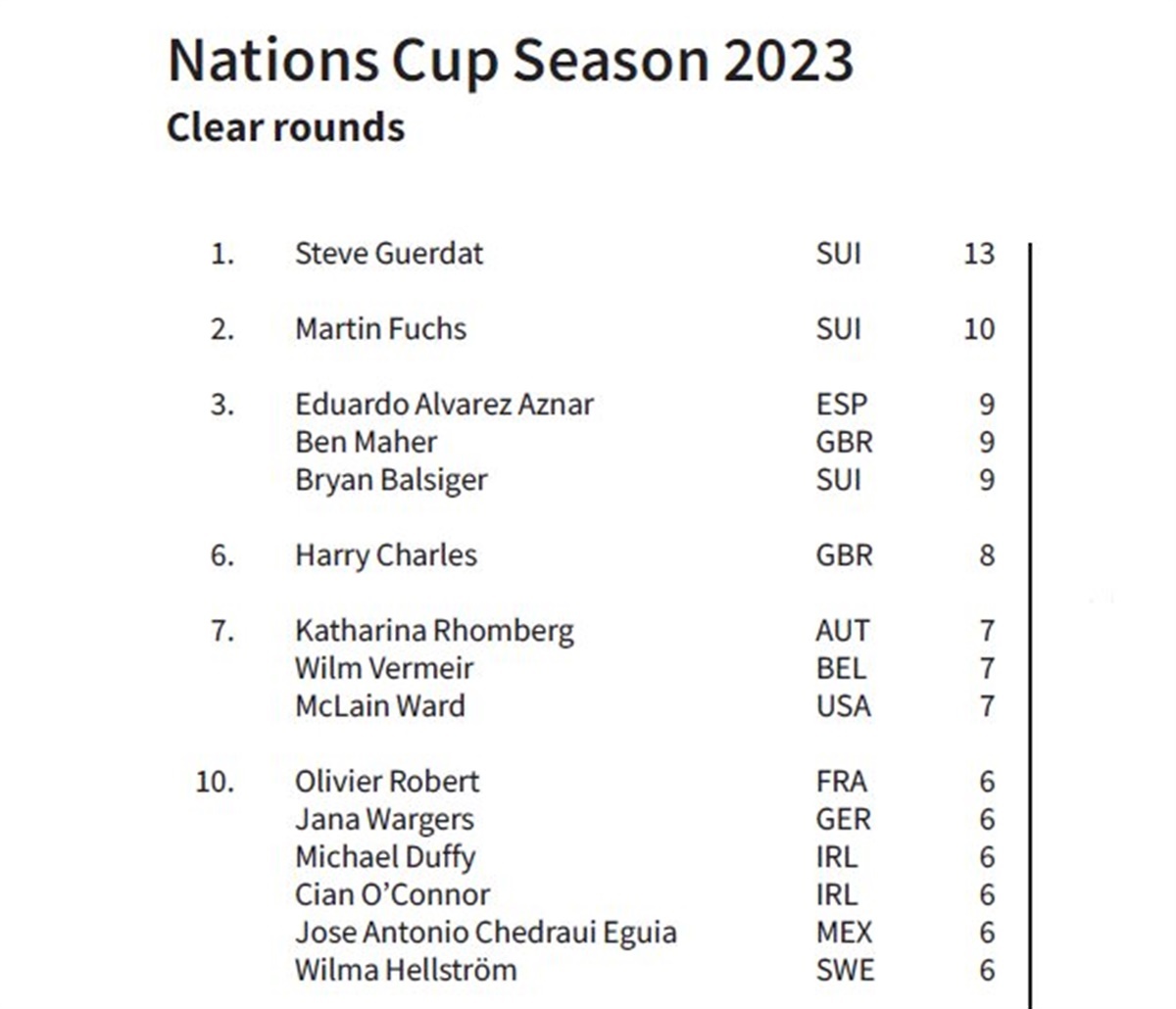 I år skiller særligt én rytter sig ud og kan fejre titlen som "Mr. Nations Cup". Med i alt 13 fejlfrie runder – alle sammen ved 5-stjernede stævner – følger den schweiziske rytter Steve Guerdat efter Kevin Staut (FRA), der vandt med 12 fejlfrie runder i 2022. Andenpladsen går til Guerdats landsmand Martin Fuchs med ti fejlfrie runder, mens tredjepladsen med ni fejlfrie runder er delt mellem schweiziske Bryan Balsiger, spanske Eduard Alvarez Aznar og britiske Ben Maher.