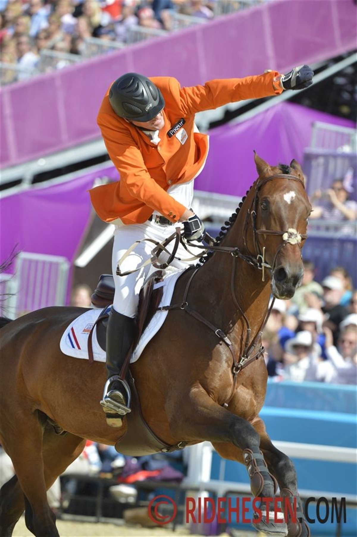 I dagens afgørende springning om holdmedaljerne ved OL i London var der spænding om resultatet fra start til slut. Efter hvert land havde haft to ryttere i konkurrence tegnede der sig dog et billedede af, at topkampen ville komme til at stå mellem Saudiarabien, England, Holland og Schweiz. Sverige var også kommet til dagens finale med fire fejl på kontoen i lighed med England, Holland og Schweiz, mens Saudiarabien havde lagt sig i spidsen med blot en enkelt fejl. Svenskerne kiksede dog i den afgørende face, da samtlige ryttere blev noteret for 4 til 16 fejl. Det betød at svenskerne sluttede på 6. pladsen med 28 fejl samme antal fejl som USA og med Brazilien på den sidste plads. Canada var kommet til finalerunden med fem fejl, ikke noget dårligt udlæg, men da de fik deres holdkammarat diskvalificeret inden gårsdagens konkurrencen på grund af af dyrlægerne, i en termografiscaning havde fundet at hesten havde et varmt område på forbenet (Se gårsdagens nyhed om hændelsen) så havde de kun tre ryttere på holdet og alle tre talte i det samlede resultat. De sluttede på 5. pladsen. Schweiz sidste rytter Pius Schwizer forsøgte at holde schweizerne inde i medaljekampen med en fejlfri runde, men da hans kolleger havde fået fejl, stod resultattavlen på 16 fejl og det gav en utaknemmelig fjerdeplads. Saudiaraberne havde set stærke ud de to foregående dage, men i dagens sidste runde fik samtlige ryttere en nedrivning, og to ryttere fik desuden tidsfejl, og det gav en samlet score på 14 fejl og dermed bronze. Guldkampen Spændingen var næsten til at skære i på stadion da Englands og Hollands to sidste ryttere skulle på banen, hver af dem kunne sikre guldet til deres hold, det krævede blot en fejlfri runde. Peter Charles Vindicat blev rystet over larmen på station den første dag, og derfor måtte han bruge andendagen til at give hesten dens selvtillid igen. I dag var det lige før han blev man of the match for englænderne, men på næstsidste forhindring fik han nedslag. Hollands Gerco Schröder var i samme situation, men også han fik nedslag, og dermed måtte der en omspringning til mellem de hollandske og engelske ryttere for at afgøre guld og sølv. Det slog ud til englændernes fordel, og så var stadion næsten ved at vælte.