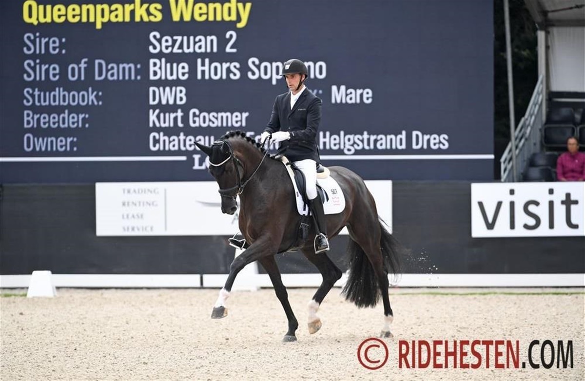 Den store sorte DV-hoppe Queenparks Wendy e. Sezuan/ Blue Hors Soprano (opdr. Kurt Gosmer), der tilhører Chateau de Fontaine og Helgstrand Dressage, var sammen med Andreas Helgstrand den allersidste ekvipage før pausen, og det lykkedes dem at lægge sig foran den imponerende KWPN-hingst Jameson RS2. Queenparks Wendy blev af dommerne belønnet med bl.a. 9,5 for skridt, 9,4 for galop og 9,2 for fremtidsperspektiv. Det var en fornøjelse at se den danske hoppe afspændt og i stand til at vise sine sande kvaliteter.
