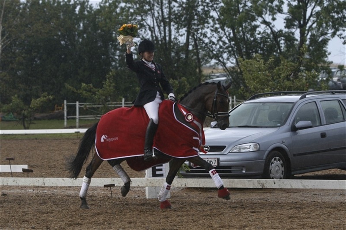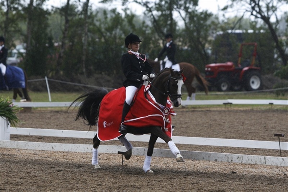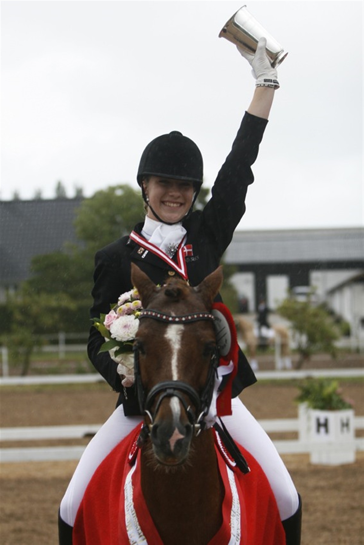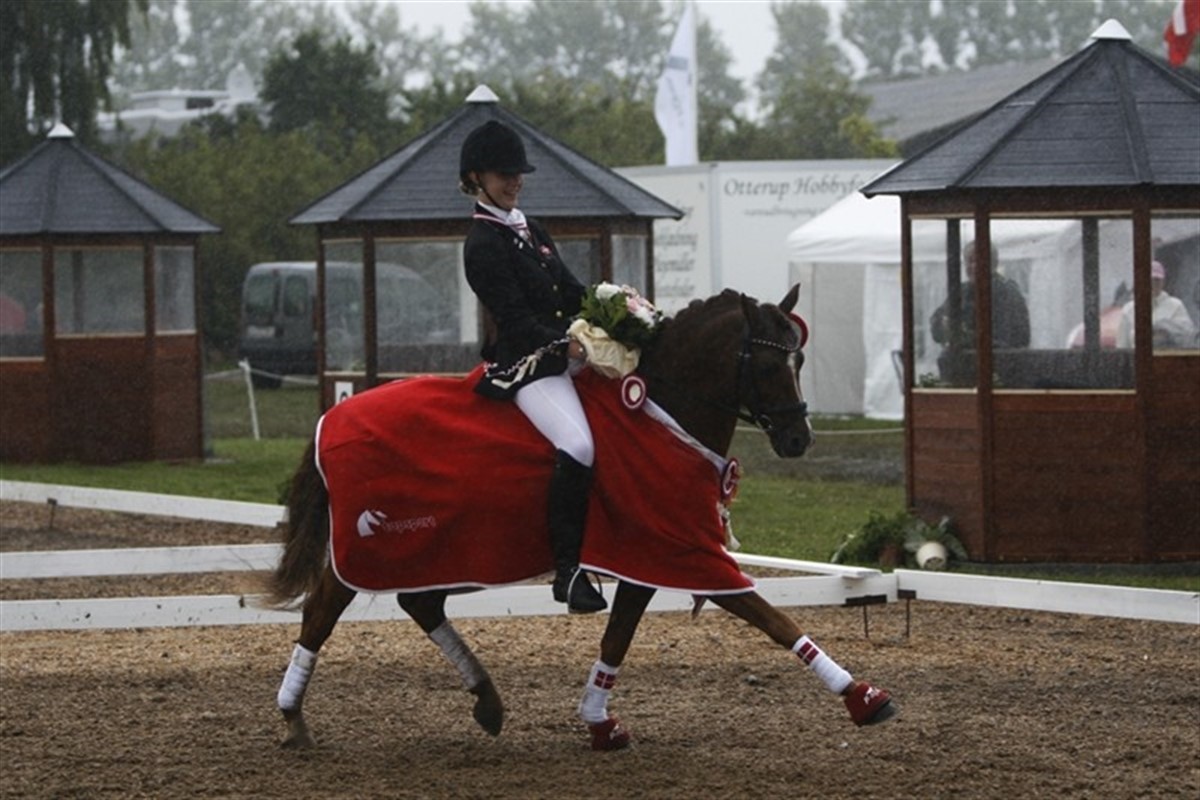 Et sandt skybrud satte fredag sit betydelige præg på stævnets start, da banerne og omgivelserne stod blanke af vand. Ihærdige arrangører fra Sportsrideklubben Bogø på Nordfyn gjorde en enorm indsats for at redde banerne, og heldigvis lykkedes indsatsen med bravour. Kategori 3 ponyerne lagde ud, og her blev vinderen Aleksandra B. Sørensen med ponyen Bonansa fra Skanderborg Rideklub. Fra et lidt mere mat ridt lørdag, leverede hun en pragt præstation i finalen, hvilket sammenlagt netop rakte til 1. pladsen og guldmedaljen. Sølvet gik til Iben Olkjær Olsen på ponyen Magic Manipu fra Århus Rideklub mens bronzemedaljen blev vundet af Emilie Holm Toft på Sødal Makong fra Kolding Rideklub. Hos kategori 2 ponyerne var der i toppen af feltet meget stabile præstationer i både kvalifikationen og finalen, men det længste strå blev trukket af Christina Møller på Casio fra Dalumgård Rideklub. Christina og Casio har haft en helt forrygende sæson med guld til NM både individuelt og for hold, og bronze ved EM for hold, ligesom det blev til en individuelt 8. plads ved EM. Desværre er det Christina’s sidste sæson som ponyrytter, så det er ikke uden vemod hun inden længe sender Casio videre til en ny lille rytter. Sølvmedaljen for kategori 2 ponyerne gik til Anne Fabricius Tange og Kosmo Ike fra Vestbirk Rideklub, mens der var bronze til Celine Dufour og Charlie fra Vallø Sportsrideklub. Igen ved kategori 1 ponyerne, var toppen af feltet præget af meget stabile præstationer. Vinderen blev Nanna Skodborg Merrald på Centrum fra Hvalsø Rideklub, der med to kanonridt til over 73% begge dage, sikrede hende en velfortjent sejr. En sejr der på tilskuerpladserne var udbredt enighed om, gik til en dygtig og sympatisk rytter, der tilmed gennemførte ridtet i styrtende regn. Af Dorte Bak Himmelstrup.