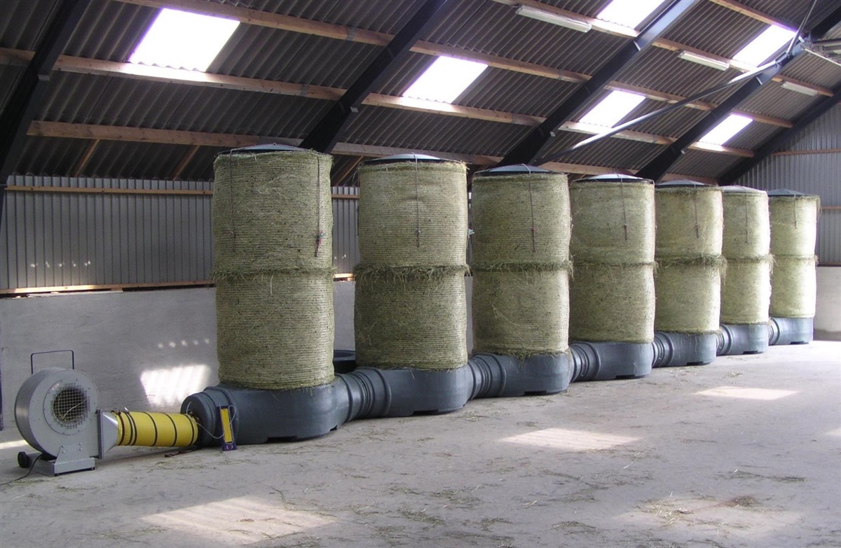 Hø-tørringsanlægget som Klaus Holt har udviklet kaldes Hay-Dry. Anlægget er opbygget af moduler, der kan sættes sammen, så det passer til den enkeltes behov. Modulerne er fremstillet i komposit, et kraftigt plastic-materiale, hvilket gør dem særdeles robuste, lette at flytte rundt på samtidig med at prisen på anlægget kan holdes på et fornuftigt niveau. En blæser sender luft ud i anlægget og op i høballerne, der stables oven på modulerne to og to og afsluttes af en ”hat” ligeledes i komposit. - Modulerne vejer ikke ret meget og kan sættes væk, når der ikke er brug for dem, fortæller Klaus Holst og informerer om, at anlægget er særligt velegnet til mindre høproducenter, da det er nødvendigt at se til høet under tørringsprocessen og hele tiden have øje for fugtigheden, der gerne skal ned omkring 17-18 procent, så man får stråfoder af top kvalitet, der kan holde en hel vinter. – Lige nu foregår målingen med et spyd, der stikkes ind i ballen, men på sigt, og gerne inden for et lille års tid, er planen at anlægget selv kan styre fugtigheden.