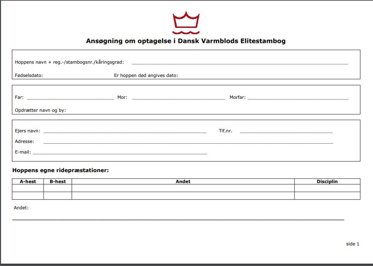 På Dansk Varmblods hjemmeside kan man finde flere oplysninger om reglerne for optagelse samt finde et ansøgningsskema, der skal indsendes til forbundet. Det er iøvrigt gratis at ansøge om elitehoppestatus. Man finder info HER
