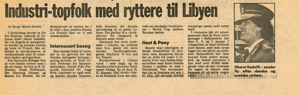 – I 1983 red jeg på landsholdet i springning, og vi blev inviteret til stævne i Libyen og fløjet dertil sammen med andre europæiske topryttere, fortæller Hasse Hoffmann. Stævnet blev en personlig succes for ham med flere topplaceringer, og der blev rettet henvendelse til ham fra inderkredsen omkring oberst Gadaffi med en forespørgsel på den ene af de to heste, som Hasse havde medbragt til Libyen. Denne hest havde hans udsendte spottet allerede ved stævnet i Neumünster, og budt på den. Og da hesten så gik godt ved stævnet i Libyen, blev ønsket om at erhverve hesten endnu større hos libyerne.