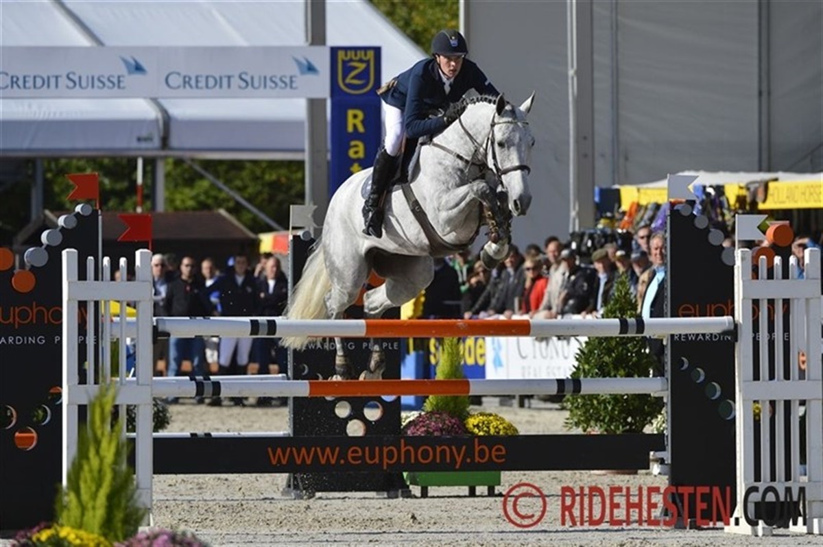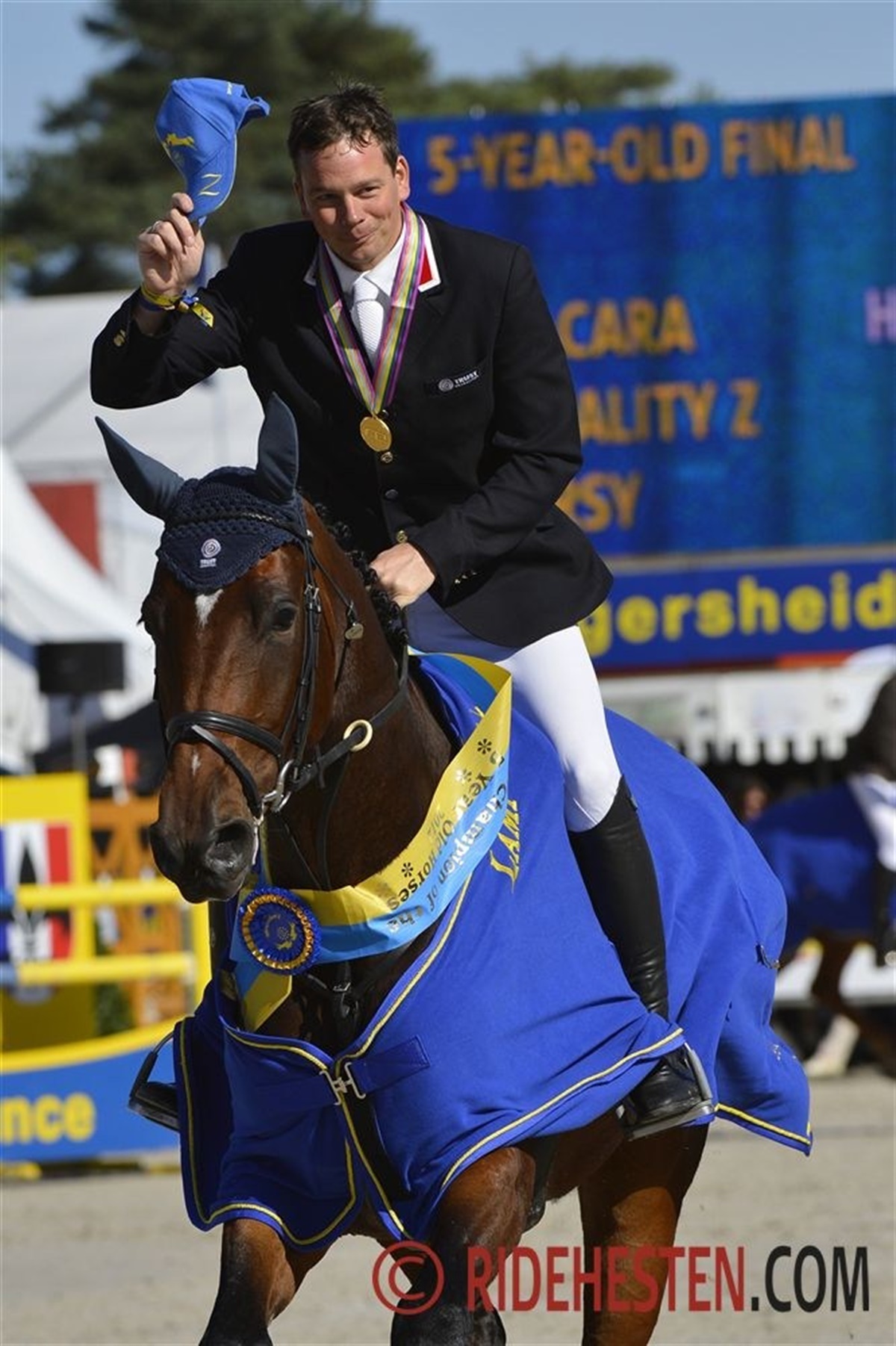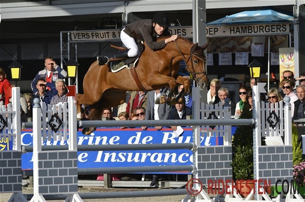 Det lykkedes desværre ikke for den spanske rytter Manuel Fernandez Saro at ride DV-hoppen Pure Heart ind i omspringningen, heller ikke klassens anden Heartbeat-søn Hasard redet af svenske Victoria Almgren nåde omspringningen. Ialt 13 ekvipager var fejlfrie og der blev rigtig kamp om sejren, og det er imponerende at se de 5-årige heste angribe forhindringerne med lyst og mod, selvom det endnu er svært helt af styre talentet og kraftoverskudet for enkelte af de unge heste. Gerben Morsink fra Holland indledte omspringningen med en forrygende hurtig, fejlfri runde med Coursy en Carthino Z-søn registreret i KWPN. 36,71 sekunder tog han om at ride banen på den forsigtige vallak. Først godt midtvejs i omspringningen blev Morsinks tid rigtig udfordret af Pieter Clemens fra Belgien på Casuality Z, der som navnet antyder er registreret på Zangersheide og efter Cassini II. Det var populært hos hjemmepublikummet, da han galopperede i opskruet tempo mod den sidste oxer og stoppede tiden på 36,08 sekund. Det hele skulle så afgøres af tyske Toni Hassmann, der havde været omspringningsbanen igennem med Harly PKZ e. Contact v. Heffinck og fået 12 fejl. Med holstener-hoppen Con Cara e. Con Air red han efter sejren, men hoppen stod næsten stille foran to forhindringer og to gange hoppede bommene i holderne på forhindringerne. Da han galoperede mod sidste forhindring animerede publikum ham til at ride til, men han "ruskede" lidt ro på hoppen, og kom fejlfrit i mål. Det var derfor overraskende, at tiden standsede på 35,27 sekunder, men hoppen er udstyret med en jordvindende galop, og så fik den erfarne tysker redet et par snævre vendinger undervejs. Læs mere om rytternes reaktioner, deres planer og ønsker for fremtiden for deres unge heste i magasinet Ridehesten.