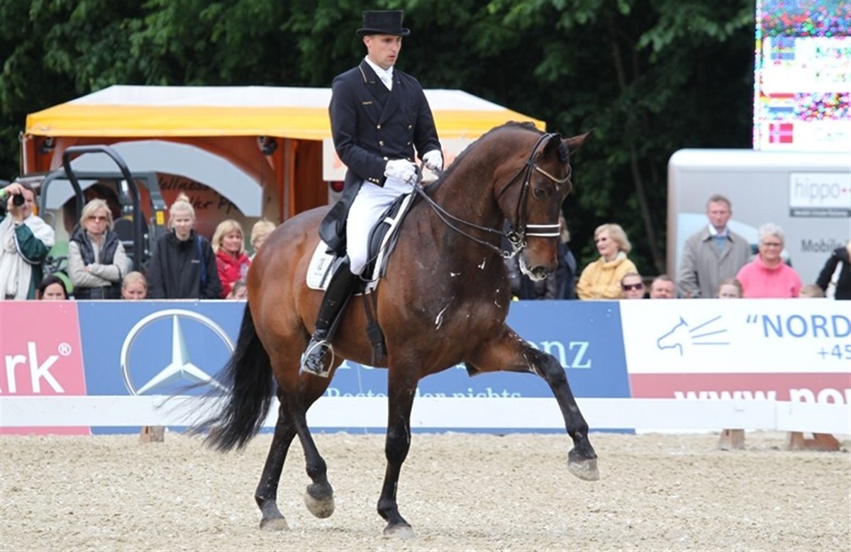 Andreas Helgstrand og den 11-årige DV-vallak Marron e. Michellino / Woernitz blev i dag nummer to i Grand Prix dressur med 72,87% ved det internationale dressurstævne CDI**** i Hamborg. På trods af deres kun få måneder gamle samarbejde har de allerede vist rigtig gode takter, ikke mindst med sejren i First Horse Grand Prix Kür i Bernstorffsparken sidste weekend. I Hamborg sejrede tyske Hubertus Schmidt og Valentino G e. Ferro / Damiro med en samlet score på 74,26%, og tredjepladsen gik ligeledes til en tysk ekvipage, denne gang Anabel Balkenhol på hesten Rubins Royal e. Rubinstein / Vargas XX, der opnåede 71,58%. Danske Martin Christensen og Aribo 4 e. Acord II / Admirano startede også i klassen, men endte uden for placering. Se alle resultaterne fra klassen via linket til højre.