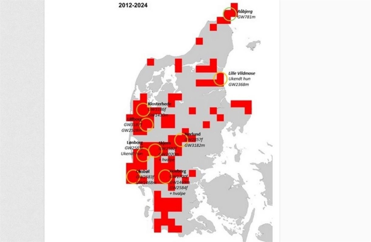 På nedenstående billedes ses geografisk fordeling af sikre og bekræftede fund af ulv i Danmark i perioden 2012-2024. Orange cirkler markerer områder med ulvepar, mens grønne cirkler markerer områder med stationære enlige ulve.