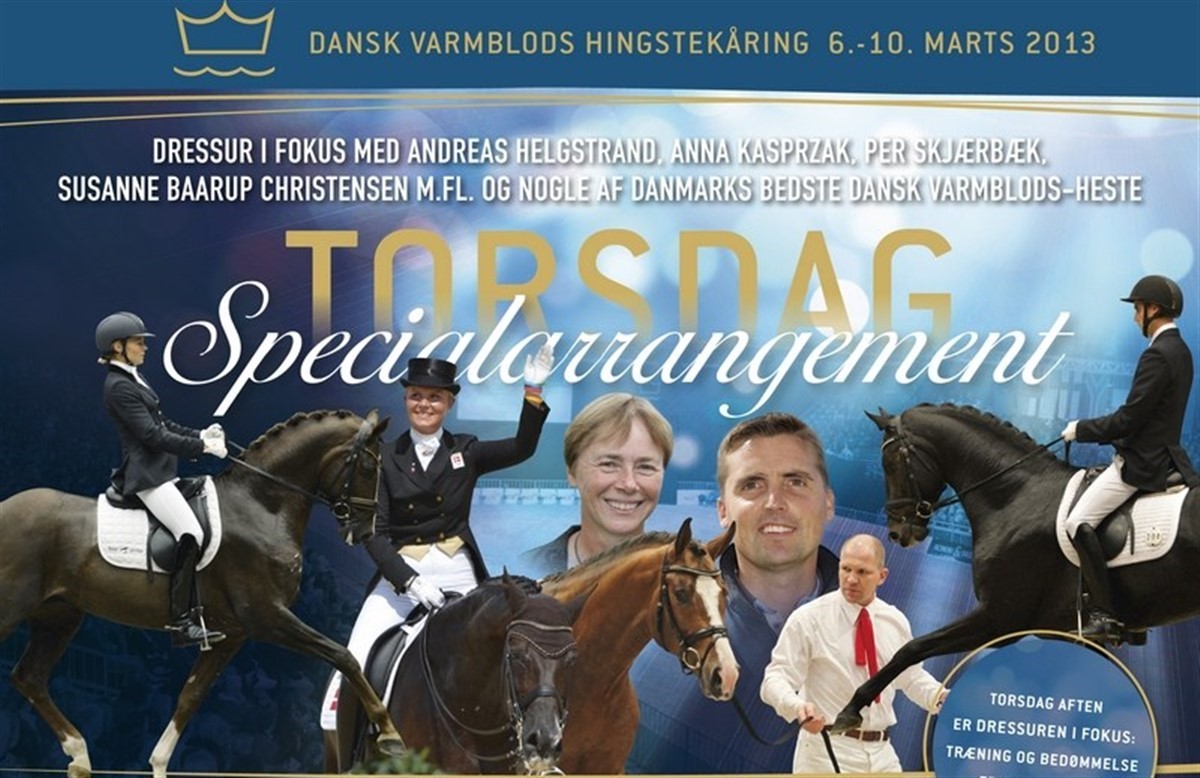 Dressur i fokus Torsdag aften er dressuren i fokus. Følg træning og bedømmelse fra unghest til Grand Prix - Hvordan trænes en unghest? - Hvordan udvælges en god unghest? - Bliver en god unghest også en god Grand Prix hest? - Hvordan bedømmer dommerne, trænerne og hingsteholderne en unghest - og er de enige? Se Grand Prix-øvelser kommenteret af dommer Susanne Baarup Christensen Se og hør hvordan Anna Kasprzak og Andreas Helgstrand planlagde opvarmning ved sommerens OL Oplev Andreas Helgstrand på 10-tals hingsten Sezuan Dette er blot nogle af det ting, som toprytter og træner Andreas Helgstrand, berider, rytter og hingsteholder Per Skjærbæk, international dressurdommer Susanne Baarup Christensen og OL rytter Anna Kasprzak vil komme ind på i løbet af aftenen. "Dressur i fokus" bliver en aften i selskab med en række af dansk dressursports største kapaciteter, og der bliver med garanti masser af tip og tricks, du kan tage med hjem. Billetter kan købes på Dansk Varmblods hjemmeside via linket til højre.