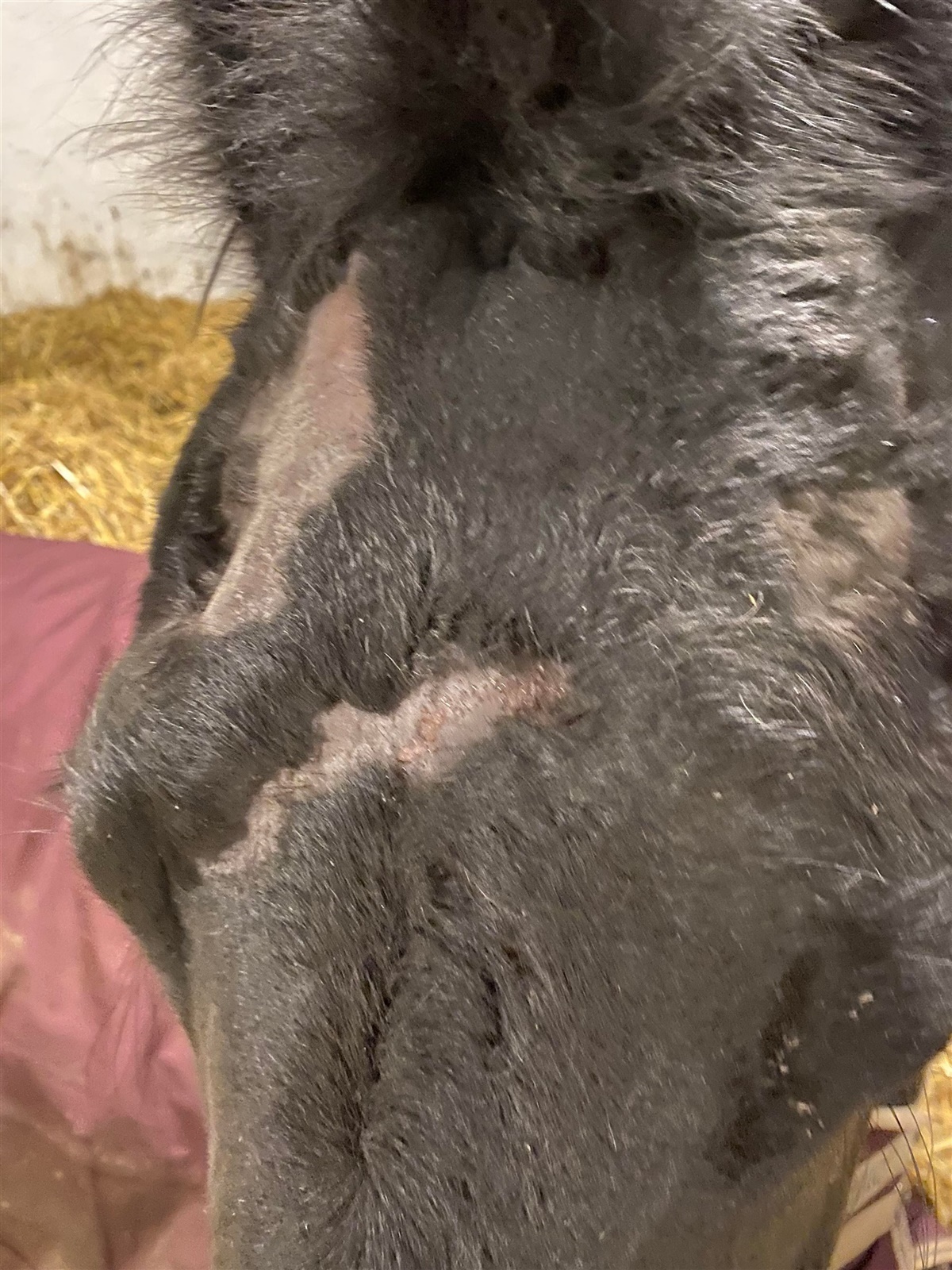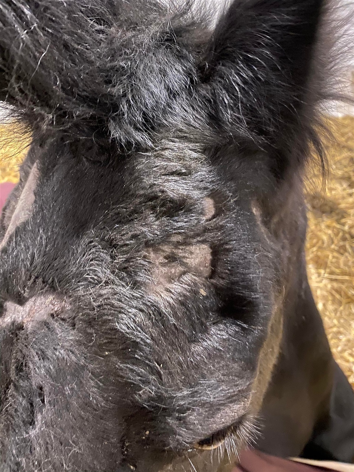 – Om morgenen kunne jeg se, at min 14-årige drægtige frieserhoppe var hårløs i hovedet. Jeg antog, at hun havde slået sig på folden eller i stalden, og da min veninde kom gennemgik vi fold og stald nøje, for at finde steder, hvor den kunne have pådraget sig skaden, forklarer Lærke og fortsætter: