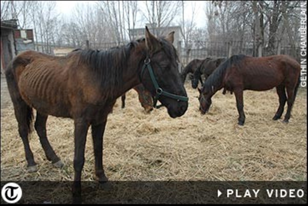 Tidligere ville de sultne heste have trukket hestevogne i byen, eller været med på job i markerne, som hestene har gjort det i Romænien i århundrede. Men nu er de sluppet løs i gaderne, forladt af deres ejere og de er taberne i et fortvivlet forsøg på at bringe landet på linie med de øvrige i den Europæiske Union - hvor en ny lovgivning forbyder hestetrukne køretøjer fra hovedveje. I løbet af den seneste måned har hundrede af løse heste søgt efter føde på gader og parker i Romæniens store byer. De er så udhungrede, at de knap kan vakle afsted, nogle er døde, hvor de er faldet ude af stand til at komme på benen igen. Hestene er tyde og bære tydelige mærker af mishandling, og nu vil myndighederne forsøge at indfange de mange heste og sende dem på slagterhus. Grunden til at hestene går løse i gaderne er den simple, at deres tidligere ejere har vurderet at det er for kostbart og unødvendigt at fodre på hestene, når de ikke må bruges til at trække vognene med. Det romænske politi, som forklarer, at de har været under pres fra EU for at gennemføre forbudet mod de hestetrukne køretøjer, forklarer, at mere end 10 procent af landets 8.400 alvorlige trafikulykker skyldes heste. Mere end 1000 hestevogne er blevet belaglagt siden politiet begyndte at gennemføre lovkravet. Problemet er nu også, at en stor del af befolkningen, som f.eks. en del landmænd, nu har problemer med at komme ud til deres marker og passe deres afgrøder, fordi de ikke længere må bruge hestetrukne køretøjer. Se den barske video ved at klikke på linket til højre.