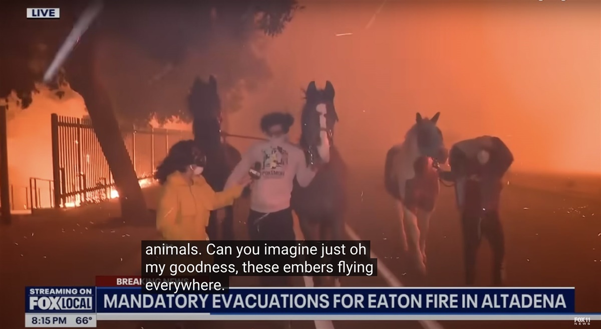 Flere hesteejere prøver desperat at redde deres heste fra de hærgende omstændigheder, og TV-kanalen Fox11 Los Angeles mødte under en af deres nyhedsindslag flere hesteejere, der kom trækkende med deres heste i kampen om at redde dem fra den voldsomme Eaton-brand. Hesteejerne fortæller blandt andet, at det er en kamp mod tiden, og at de bare forsøger at redde så mange som muligt. Se indslaget i videoen herunder:
