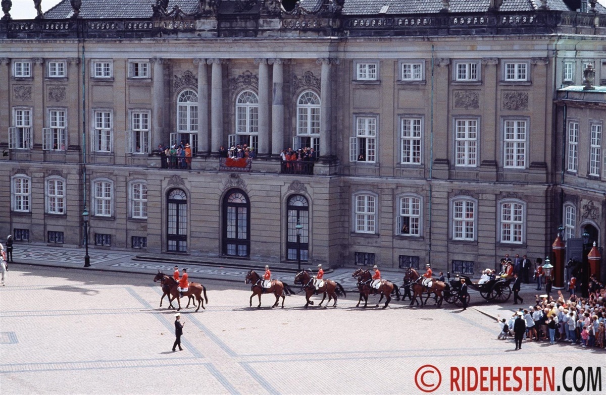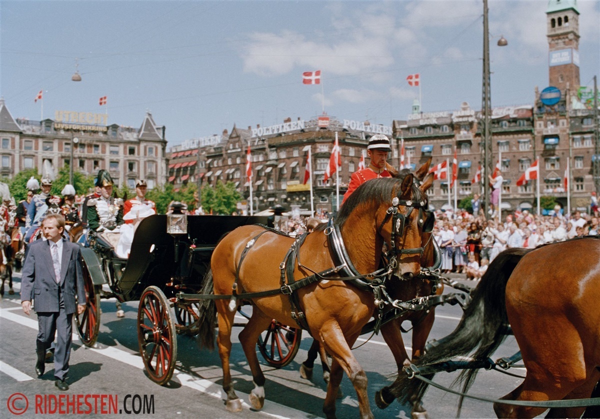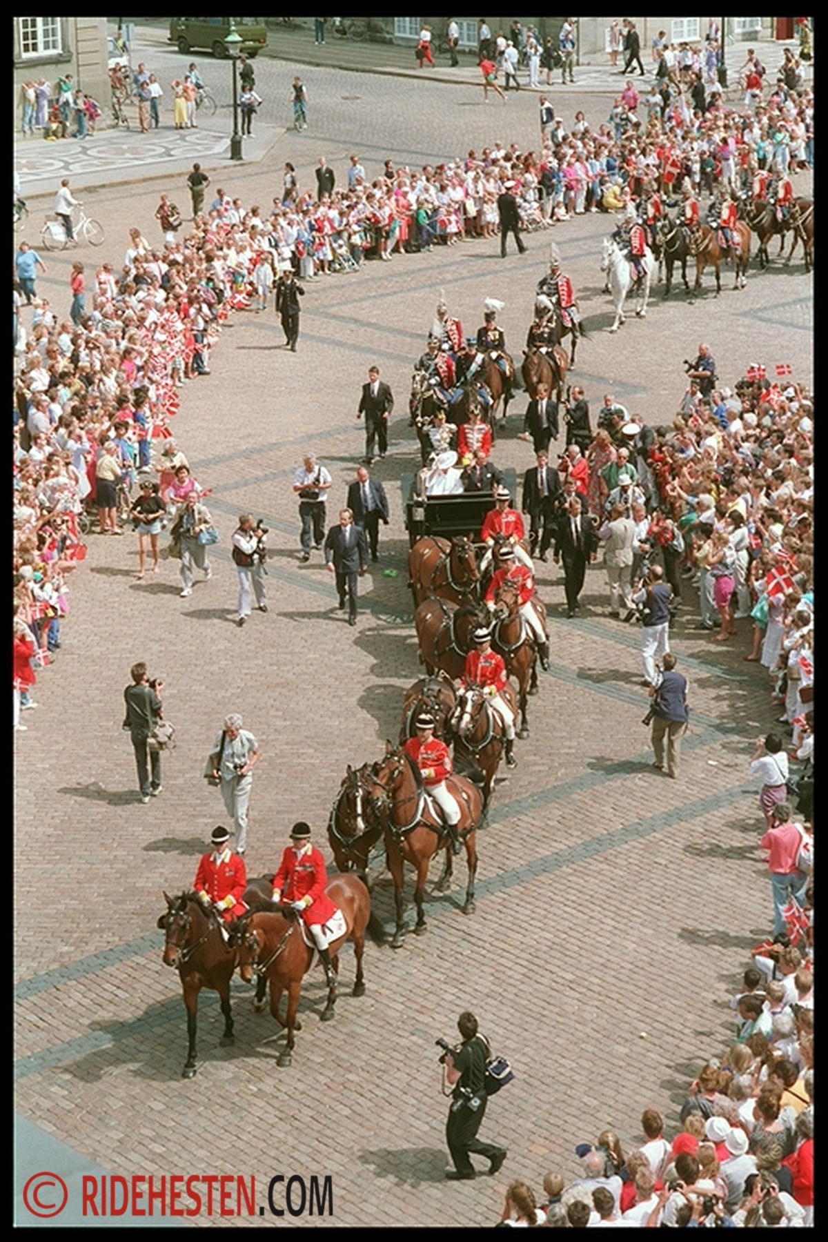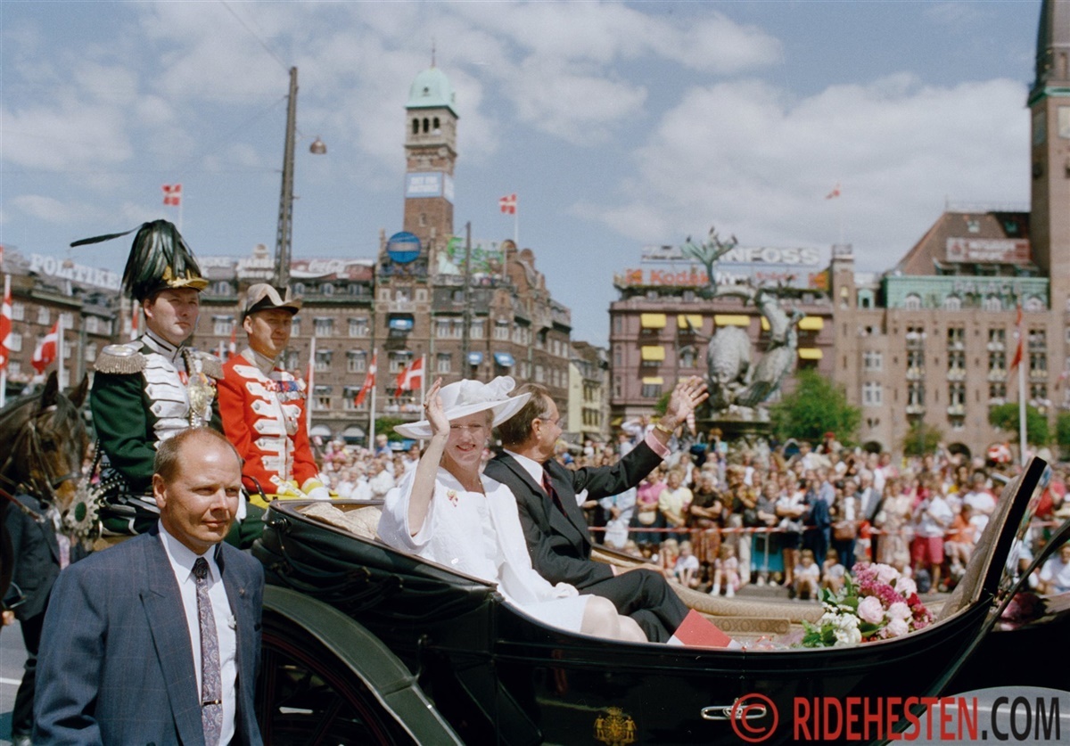 De nostalgiske fotos er fra Dronning Margrethe og Prinsens sølvbryllup i 1992, hvor de med D.K.H. Kronprinsen og Prins Joachim som kavalerer, (ridende bag ved) kørte fra Amalienborg til Københavns Rådhus med 8-spand og to forridere. Foruden prinserne som kavalerer, red også Hofmarskalen, Søren Haslund-Christensen, chefen for Gardehusarregimentet og Københavns kommandant.
