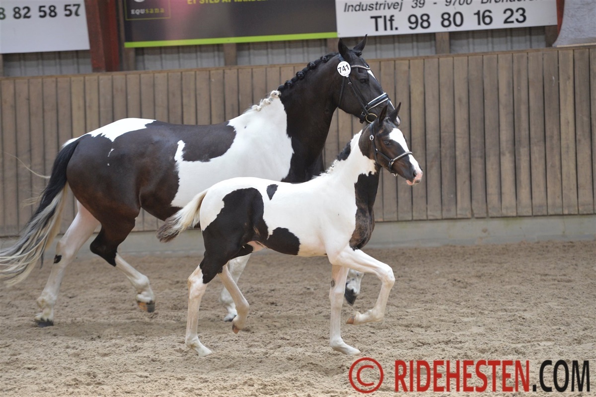 Hvid og andre farver end sort. (Hvid og brun kaldes skewbald. Hvid og sort hedder piebald.)