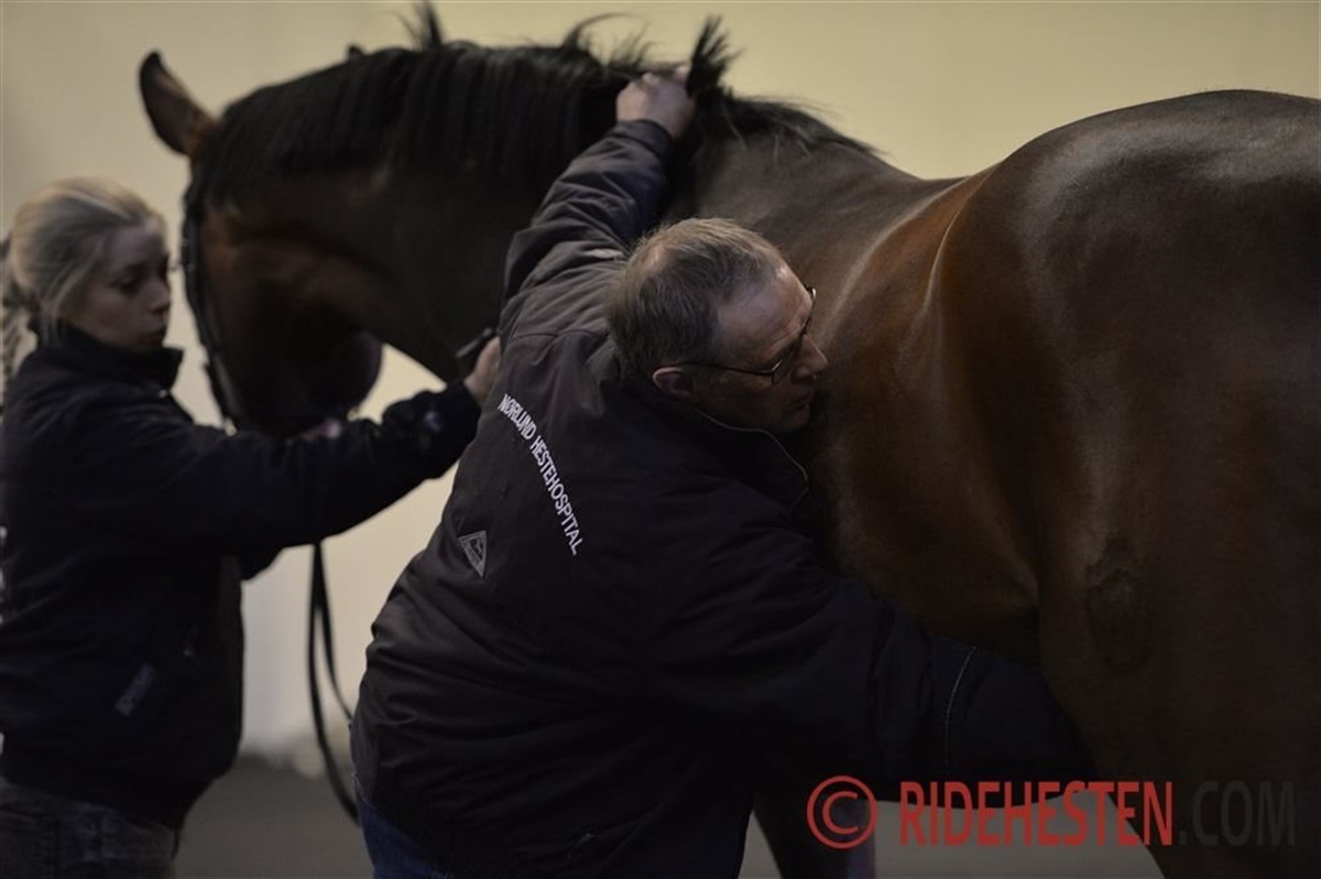 De unge hingste bliver målt (stangmål) ved ankomsten til Herning, og samtidig kontrollerer dyrlæge Hans Schougaard hingstenes reproduktionsorganer. – Det er primært testiklerne, som er i fokus. De skal være normalt udviklede, de må ikke være meget små, de skal være fuldt udviklede, og indenfor få procent, skal de også være lige store. De må ikke være drejede, og det diskuteres også, for ikke alle avlsforbund har samme til gang til det. Men vores holdning er, at avlsdyr skal have normale reproduktionsorganer.
