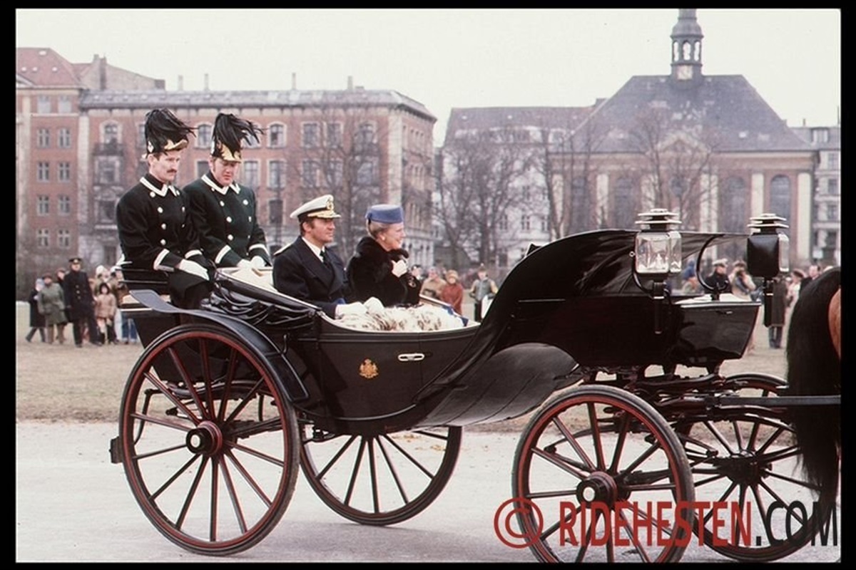 Ovenstående billede er fra marts 1980, hvor det spanske regentpar var på officielt statsbesøg, hvor karetturen med Gardehusarregimentets hesteekskort startede fra Den Kongelige Livgardes kasserne i Gothersgade, hvor billedet er taget. På lakajsædet er H.M. Dronningens to jægere Hans Jacobsen og Henning Madsen.