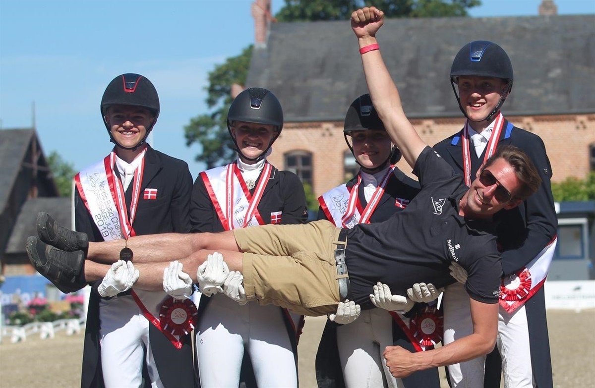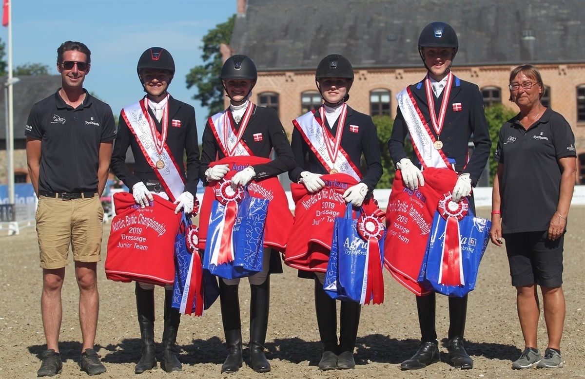 Så blev det også til holdguld for de danske juniordressurryttere! Med landstræner Dennis Fisker og holdleder Janne Jensen ved deres side sikrede Anders Uve Sjøbeck Hoeck, Alexander Yde Helgstrand, Amalie Skov Christensen og Cecilie Hedegaard en meget sikker sejr med 429,035% foran det norske hold, der tog sølv ved dette NM med Sverige på bronzepladsen.