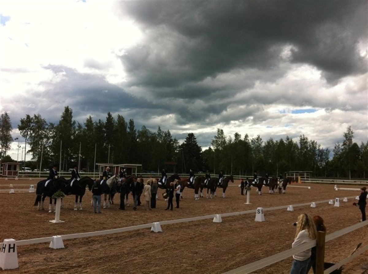 Med samlet 205,351% leverede de danske juniorryttere en stærk præstation i holdmesterskabet i finske Ypäjä, hvor landsholdet sikrede sig NM-guld. Sølvet gik til Norge med 201,622%, mens Finland fik bronze på hjemmebanen med 197,757%. Bedste danske juniorekvipage i holdkonkurrencen blev Pernille Teidor Olesen på Don Dino e. Don Cardinale / Placido, der med 70,676 % leverede klassens 2. bedste resultat. Simone Barnekow og Selimon Attrup e. Blue Hors Silver Moon / Splietau (opdr. Birthe Andersen og Flemming Mattrup) blev placeret som nr. 4 i klassen med 67,486 %, mens Cecilie Lyndrup og JJ Rocco e. Riccione / Donnerhall (opdr. JJ Horses) med 67,189 % blev placeret som nr. 5. Malou Nakszynski på Ferazzo blev nr. 15 med 61,838 %. I eftermiddag skal kat. I-ekvipagerne på dressurbanen i deres holdkonkurrence ved NM-stævnet, der omfatter NM i både springning og dressur for pony, junior og ungryttere.
