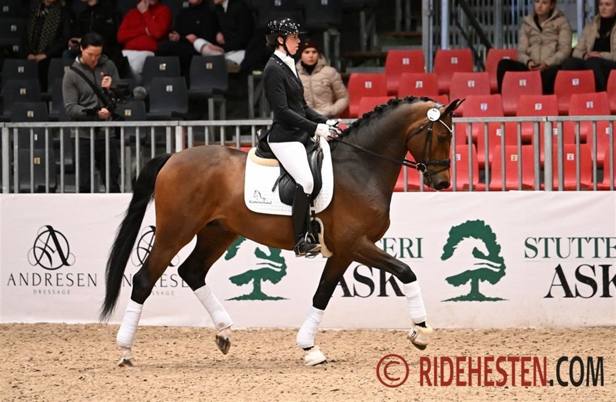 Den 4-årige dressurhingst, Svalegårds Hot Driver e. Hesselhøj Donkey Boy/ Blue Hors Hotline, vandt i efteråret Dansk Varmblods 35-dages test og rides i dag af OL-rytter Carina Cassøe Krüth, som også viste hingsten frem i Hal M i aftes, hvor holdet af dressurhingste til færdigkåring alle blev fremvist under rytter.
