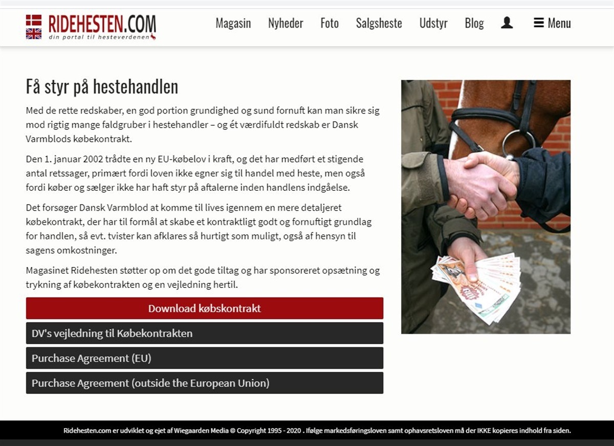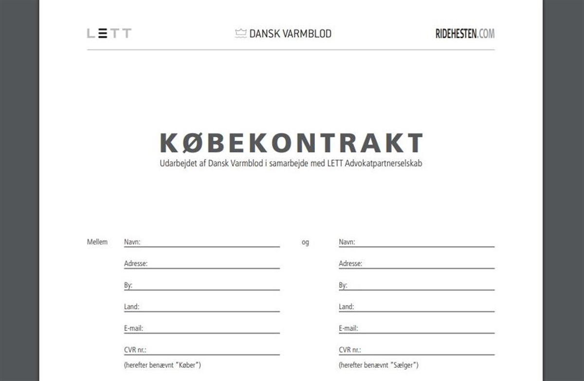 Dansk Varmblod og LETT Advokaterne anført af advokat Carsten Lorentzen har udarbejdet en omfattende købekontrakt, der samtidig følges af en god vejledning til købere/sælgere.