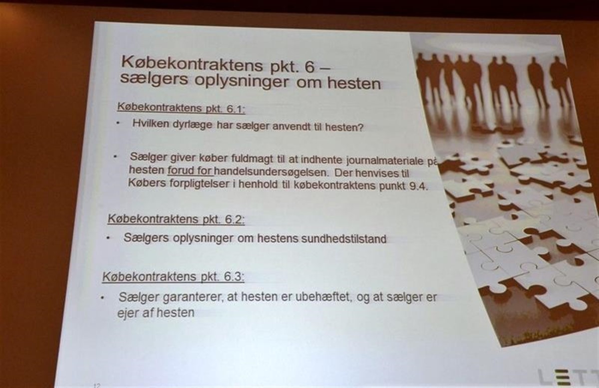 Med de rette redskaber, en god portion grundighed og sund fornuft kan man som sælger sikre sig mod mange faldgruber i hestehandlen – og her er Dansk Varmblods købekontrakt et værdifuldt redskab. Den gennemgås grundigt af Lett Advokaterne med omhyggeligt forklaring til hver enkelt punkt, og samtidig får mødedeltagerne mulighed for at stille spørgsmål vedrørende kontrakten.