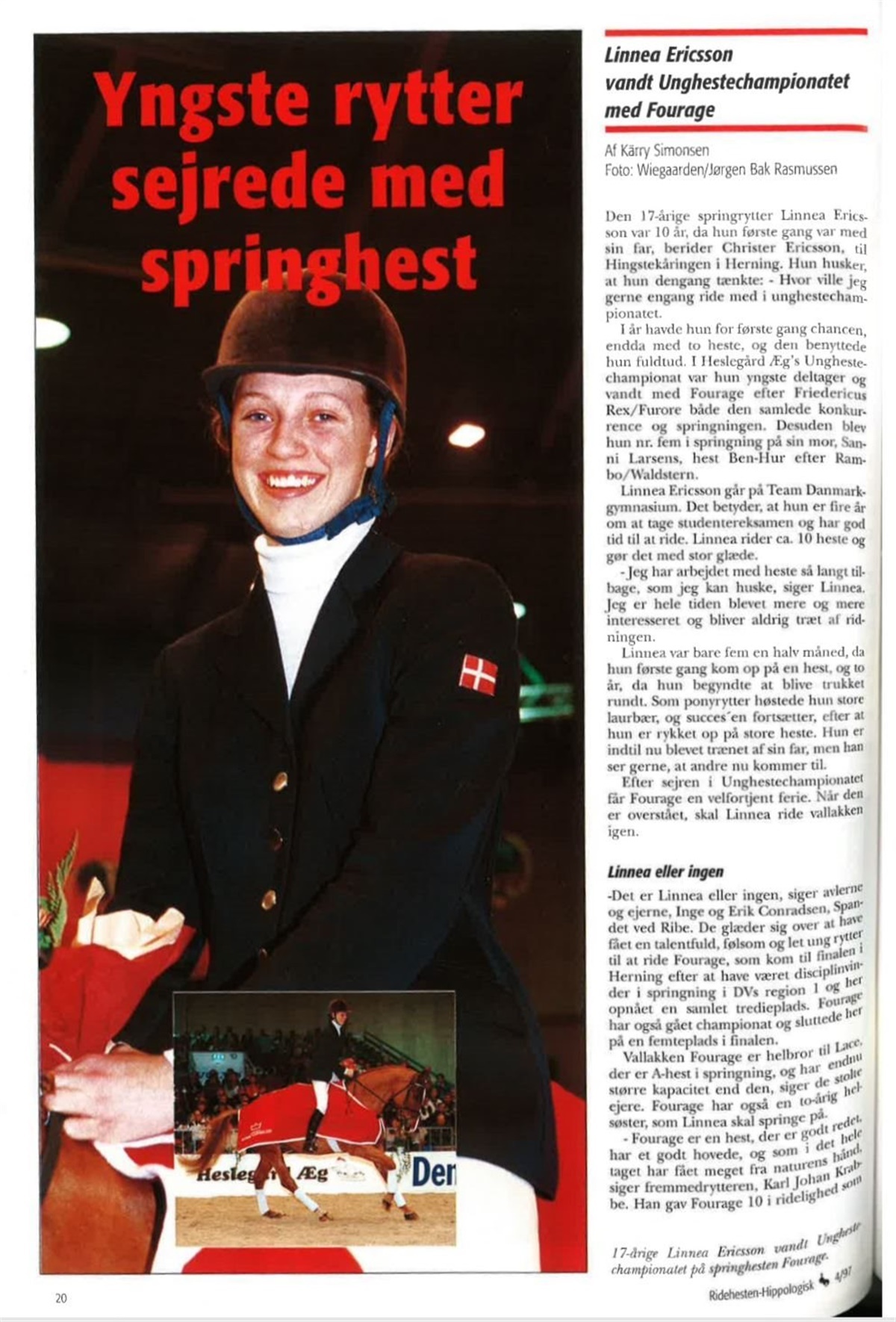 Vi er igen dykket ned i de nostalgiske artikler og denne gang faldt valget på en artikel fra aprilnummeret i 1997. Her kunne man læse om hingstekåringen i Herning, hvor den bare 17-årige Linnea Ericsson (nu Ericsson-Carey) vandt unghestechampionatet i springning med vallakken Fourage e. Friedericus Rex/Furore.