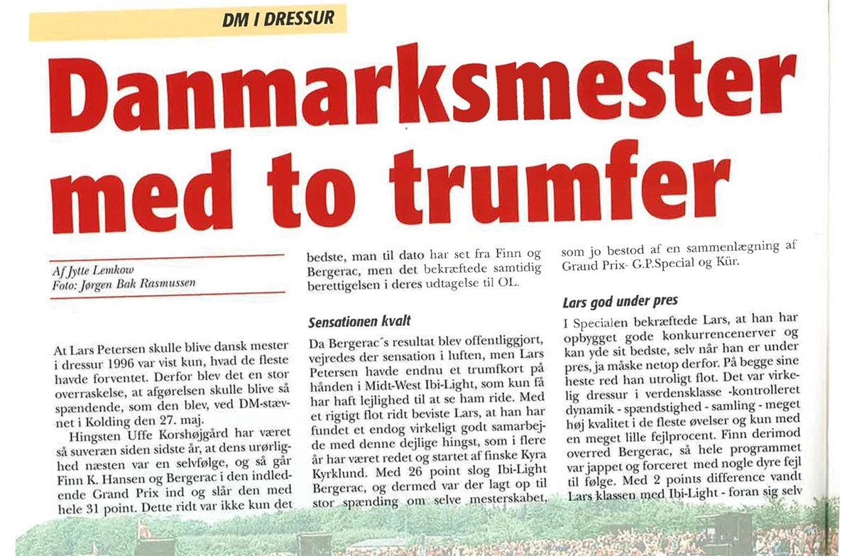 I juli nummeret 1996 bragte vi artiklen om danmarkmesterskabet i dressur skrevet af Jytte Lemkow.