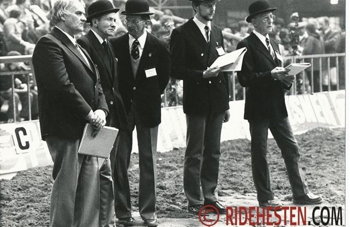 Billedet forestiller fem dommere, som er fuldt koncentrerede om hingstene, der fremvises på banen i Herning under Dansk Varmblods Hingstekåring tilbage i 1983.