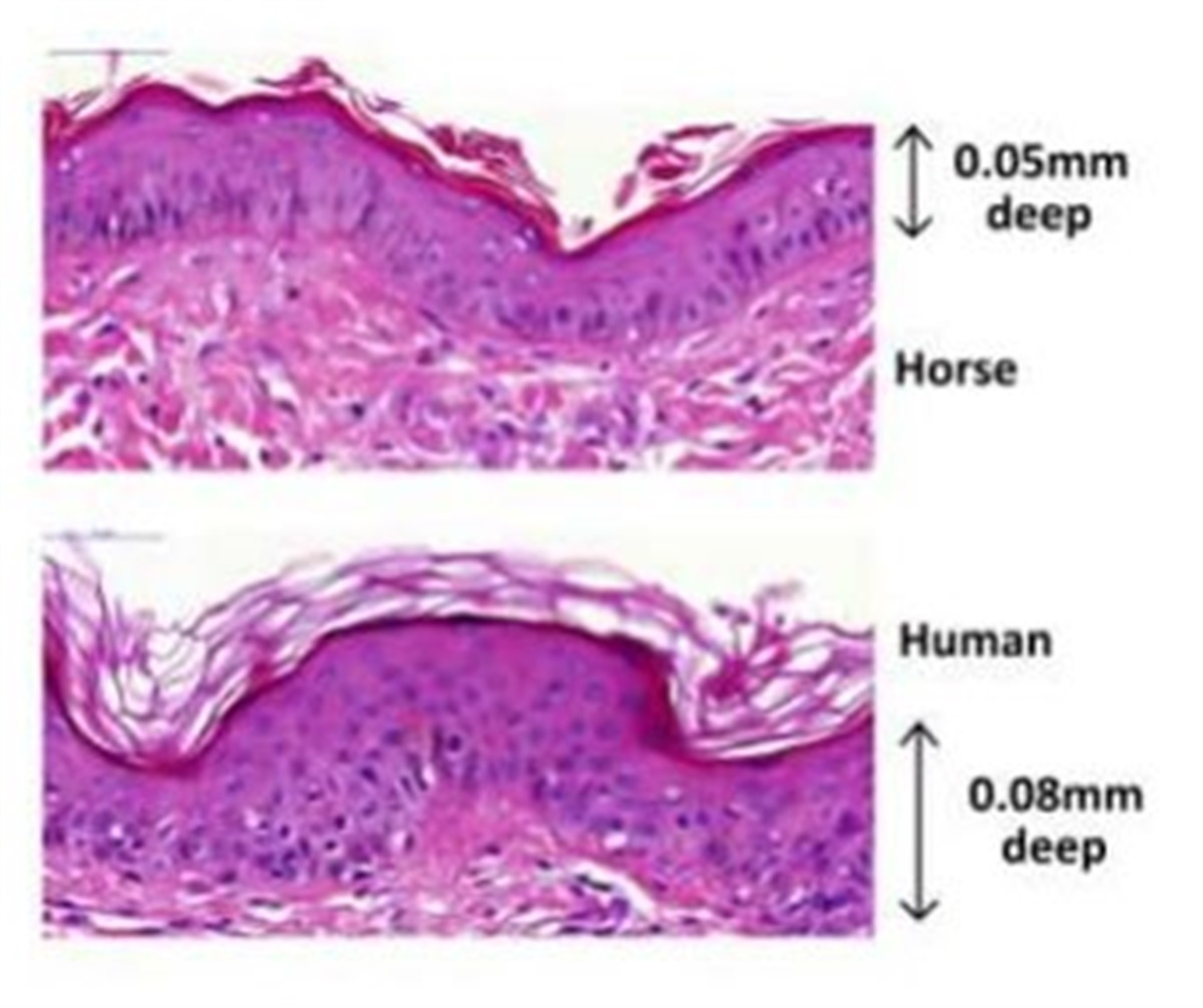 2. Hestens epidermis (det meget øverste lag af huden, hvor nervecellerne for smerter er fundet) var faktisk tyndere end den humane epidermis. Dette betyder, at hesten har færre hudceller liggende mellem kilden til smerte (f.eks en pisk), og dets følsomme nerveender. På nogle måder kan du derfor argumentere for, at når det kommer til smerte, er hestens hud tyndere. Se Figur 2