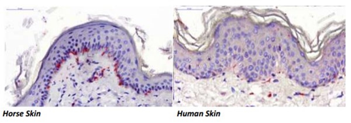 3. Endelig – findes der en særlig farve plet, kun denne kan farve nerveenderne og hermed afsløre, at hesten synes at have betydeligt flere nerveender i sin hud end den menneskelige hud, herunder nerver i epidermis (overfladiske celler), hvor smertesensation primært forekommer. Se Figur 3. ?