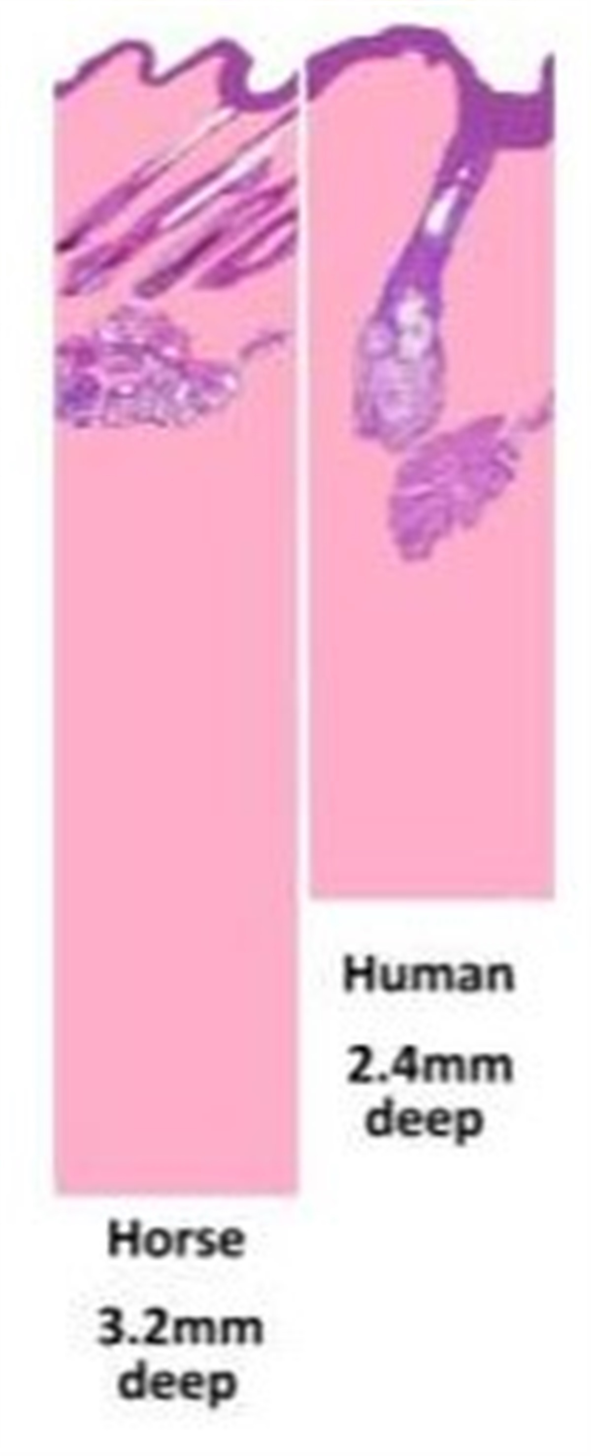 1. Hestehud var tykkere, men med mindre end 1 mm! Og det var først og fremmest bare det dybe kollagenvæv (som sidder under de overfladiske smerte følefibre). Se figur 1.