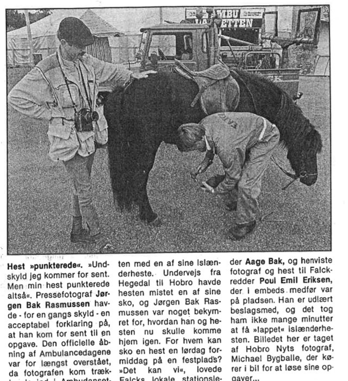 Se billedet her for at læse avisudklippet med den punkterede hest, hvor en falckredder trådte til og lagde sko på i kampens hede.