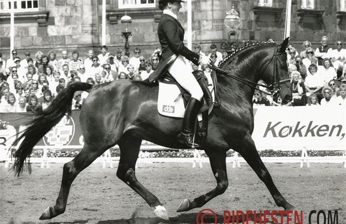 På dette billede er vi dog ikke i tvivl om motivet. Det forestiller Anne Grethe Törnblad på Supermax Ravel e. Go On Then xx ved et DM-stævne i dressur på Christiansborg Slotsplads. Hvad vi ikke ved, er hvilket år billedet er fra?