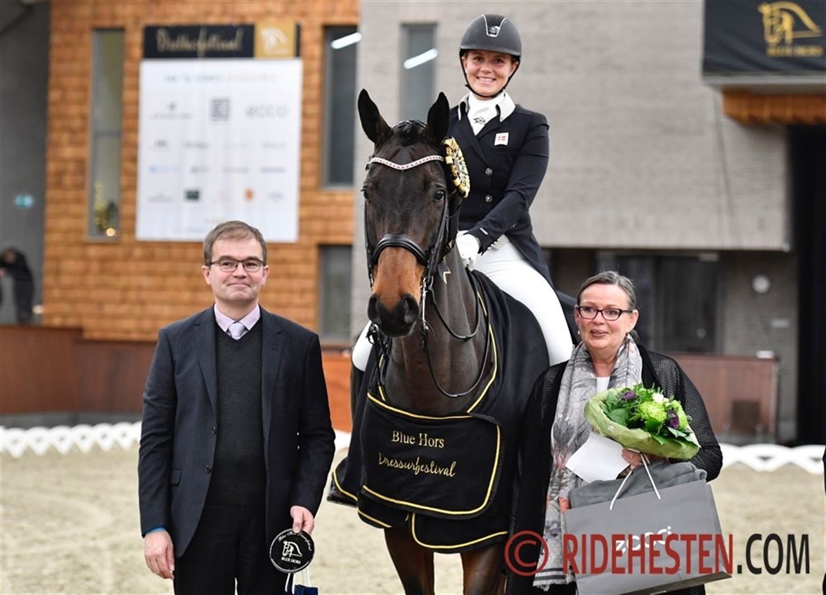 Betina Jæger Jensen har ikke haft mange træningstimer sammen med Skovlunds Gamin G e. Gagarin (opdr. Birgitte Jessen) alligevel ser deres samarbejde ud til at gå i særdeles positiv retning, og på Blue Hors viste de stor sikkerhed i flere af de svære øvelser. De opnåede 69,467% til tredjepladsen.