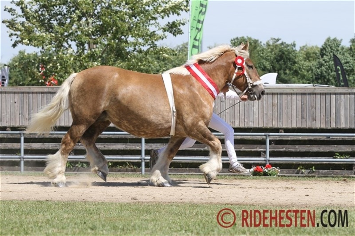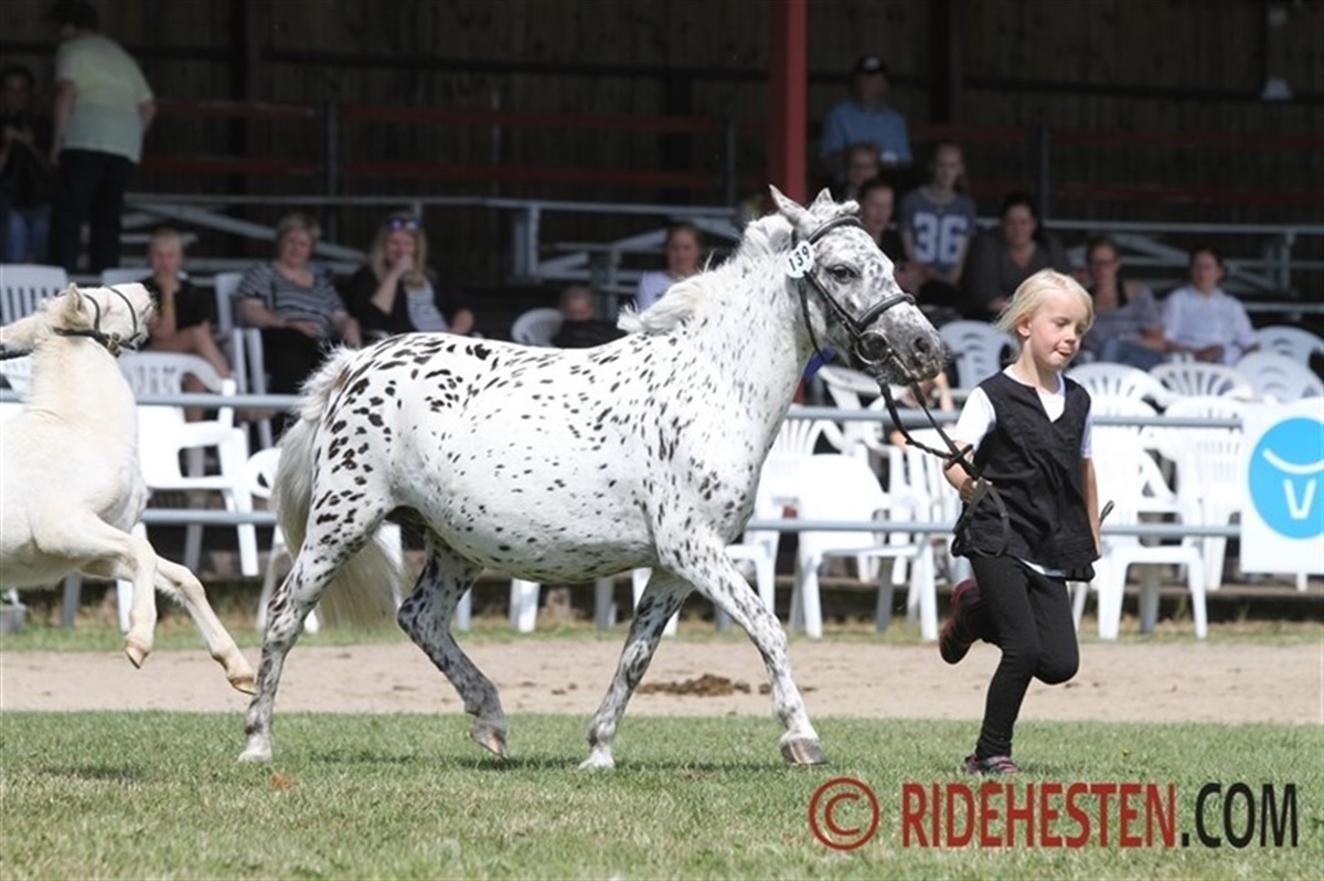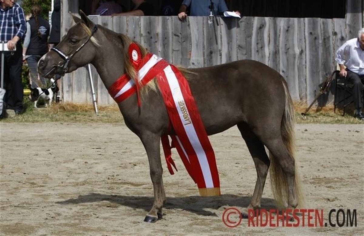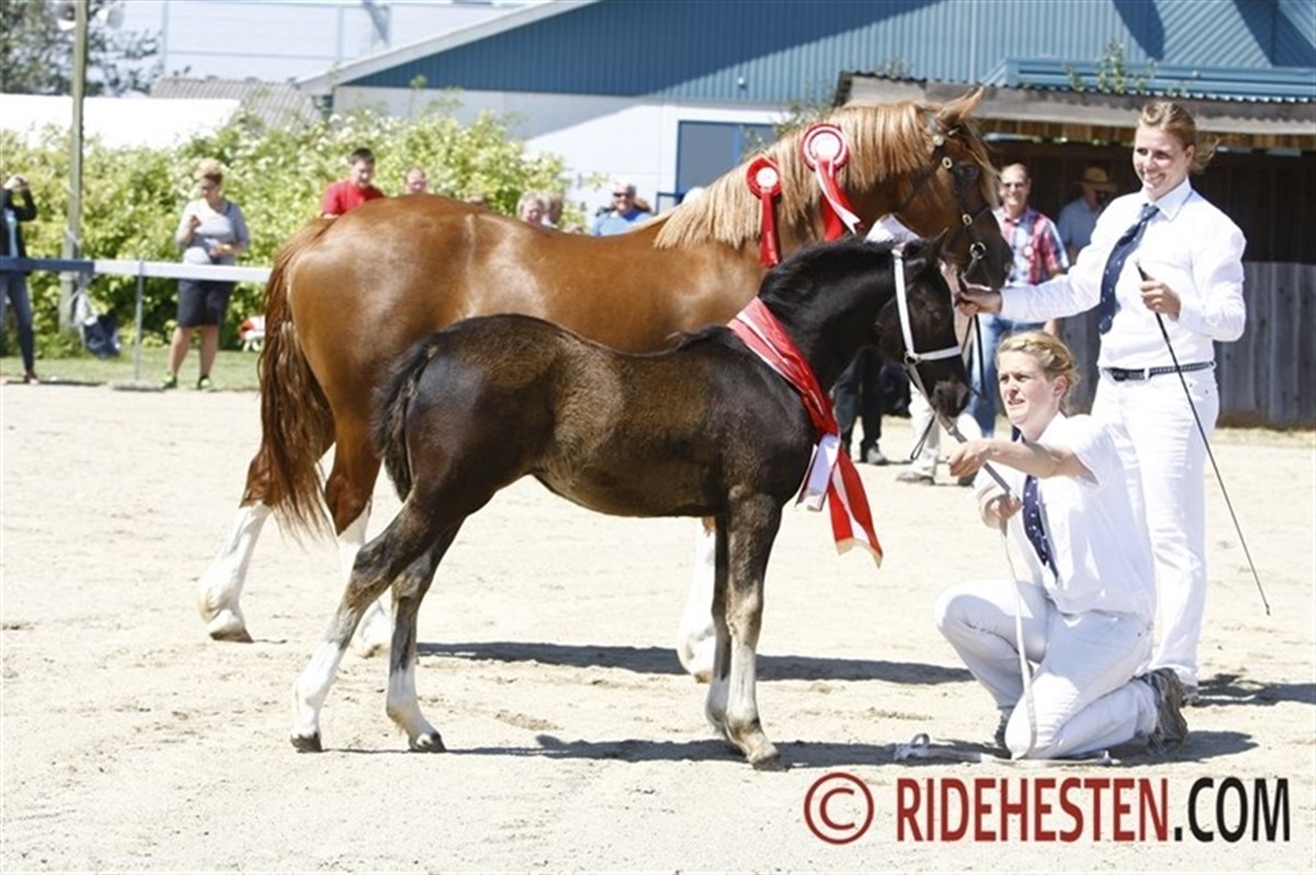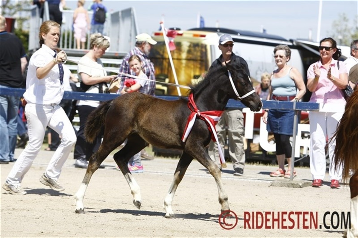 Hos følhopperne måtte ponyerne dog af vejen. Her spadserer den jydske hoppe Antoinette ind på fløjen. Den er efter Frederik III/ Mango fra fra Helle Dalsgaard. Avleren er med på Landsskuet for 32. gang, cirka 25. gang med egen hest, og hun har før hentet røde bånd.