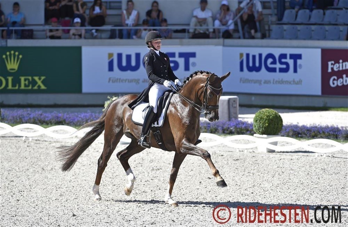 I dag stod så i kürens tegn og her blev det til tre topplaceringer for de danske DV-heste, den ene med en dansk rytter. For to år siden overtog Sara Aagaard Hyrm tøjlerne på nu 8-årige Atterupgaards Cooper e. Charmeur/Gribaldi (opdr. Atterupgaard), som Sara forventer sig meget af i fremtiden. Vallakken har også lidt at leve op til, for den har ingen ringere end Atterupgaards Orthilia som mor og i dag gjorde han sit absolut bedste. Det resulterede i at han og Sara opnåede intet mindre end 76,53% og det bragte dem direkte ind på en fornem andenplads.