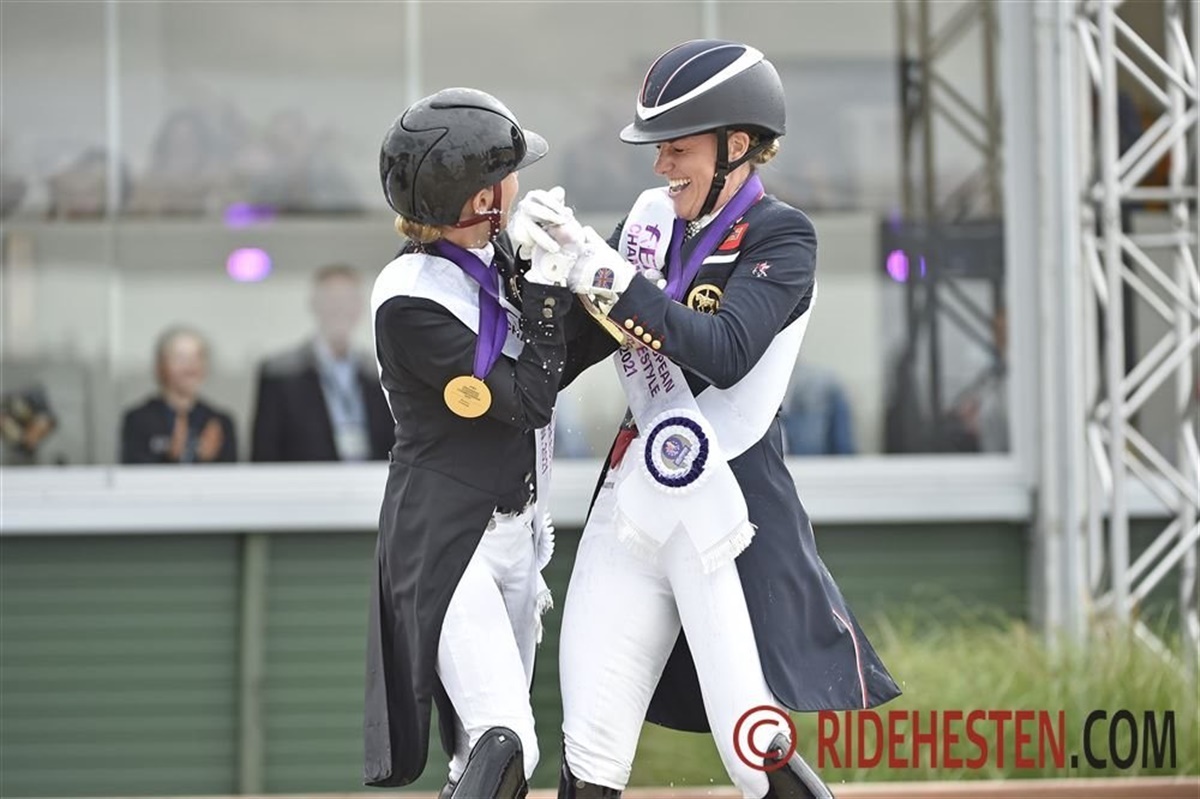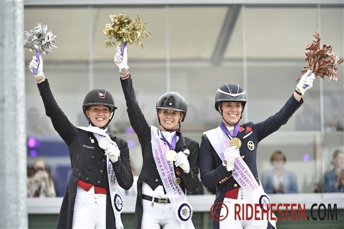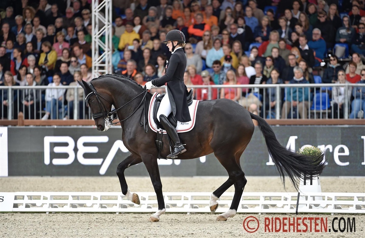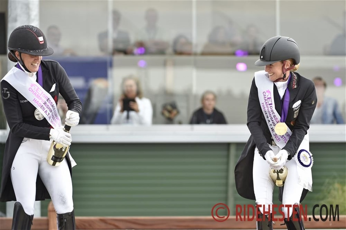 Sidste rytter, Charlotte Fry, har nu fået sit resultat, og vi ved nu med sikkerhed, at danske Cathrine Dufour og Bohemian har vundet EM-sølv her i Grand Prix Kür. Daniel Bachmann Andersen slutter som nr. 7 og Nanna Skodborg Merrald som nr. 12. Vi opdaterer med masser af aktuelle billeder.