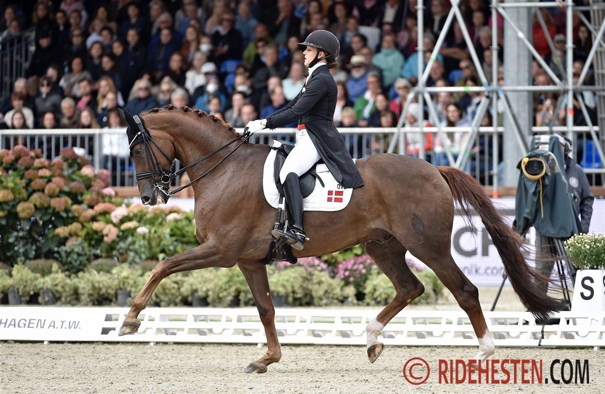Nanna Skodborg Merrald og Atterupgaards Orthilia e. Gribaldi/ Donnerschlag (opdr. Atterupgaard) var første dansker i küren. Den 16-årige hoppe dansede under Nanna og viste topkvalitet i passage og piaff. Dommernede belønnede det med 78,90% og det ligger dem foreløbigt ind på fjerdepladsen, hvor finske Henri Ruoste fører med 82,60%.