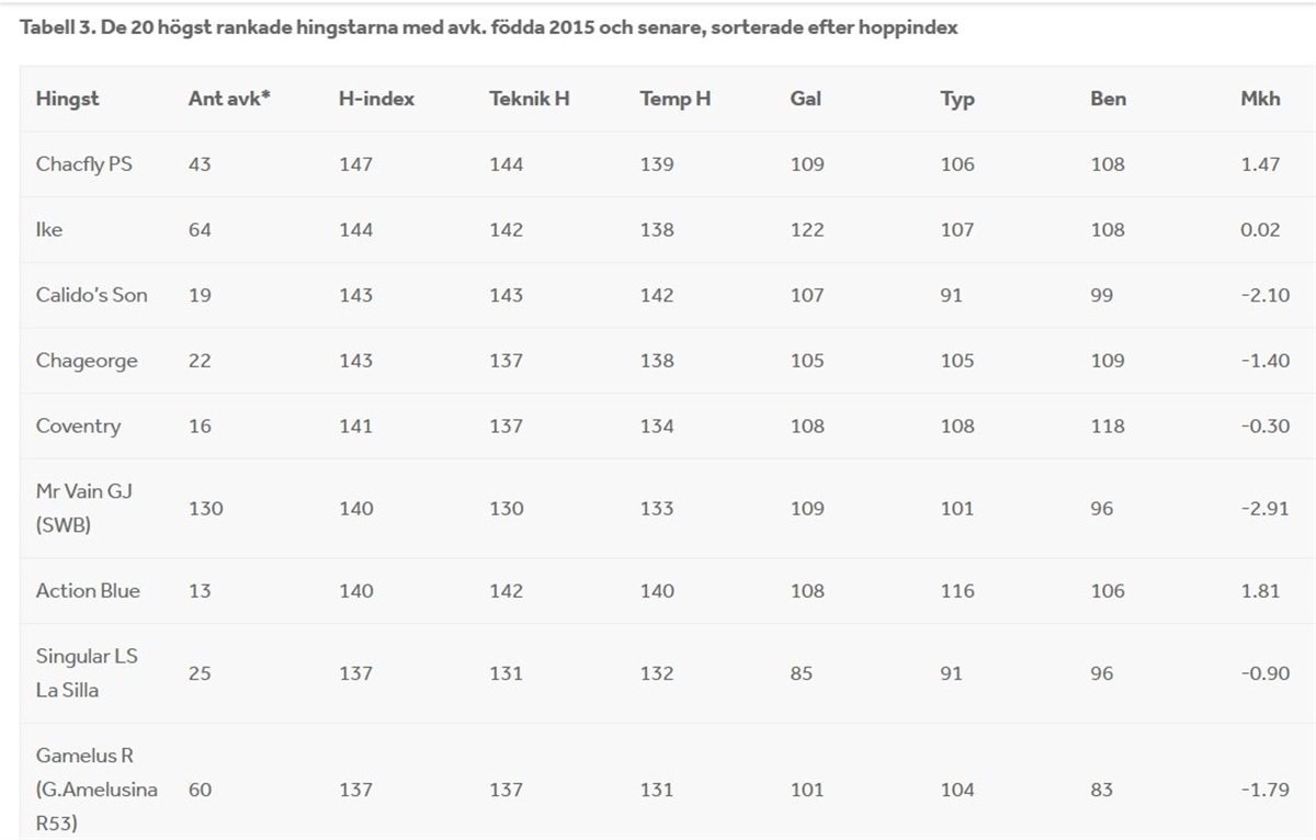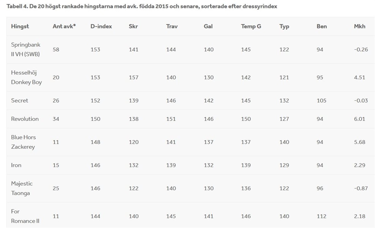 Ti springhingste har for første gang fået udregnet svensk indekstal, og af disse hingste indtager Comme Il Faut (Cornet Obolensky/ Ramiro Z) føringen foran Harvey VDL (Heartbreaker/ Carthago) og Warrant (Numero Uno/ Nimmerdor). Det er ganske vist ikke unge hingste, men de har for første gang tilstrækkeligt med afkom i Sverige for at kunne indgå i indeksberegningen. Hos de lidt ældre hingste med afkom på højst ti år har Chacfly PS (Chacco-Blue/ Sir Shutterfly) opnået det højeste indeks, efterfulgt af Ike (Zavall VDL/ Carthino Z) og dernæst Calido's Son (Calido I/ Stakkato).