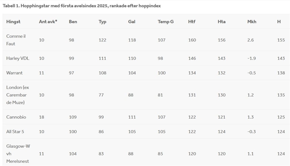 Svensk Varmblod har udgivet nye indekstal, som man kan læse alt om her. Data fra årets svenske unghestebedømmelser samt konkurrenceresultater t.o.m. 15. oktober 2025 er sammenregnet med tidligere års bedømmelse og resultater og udgør til sammen de nye indekstal for avlshingste.