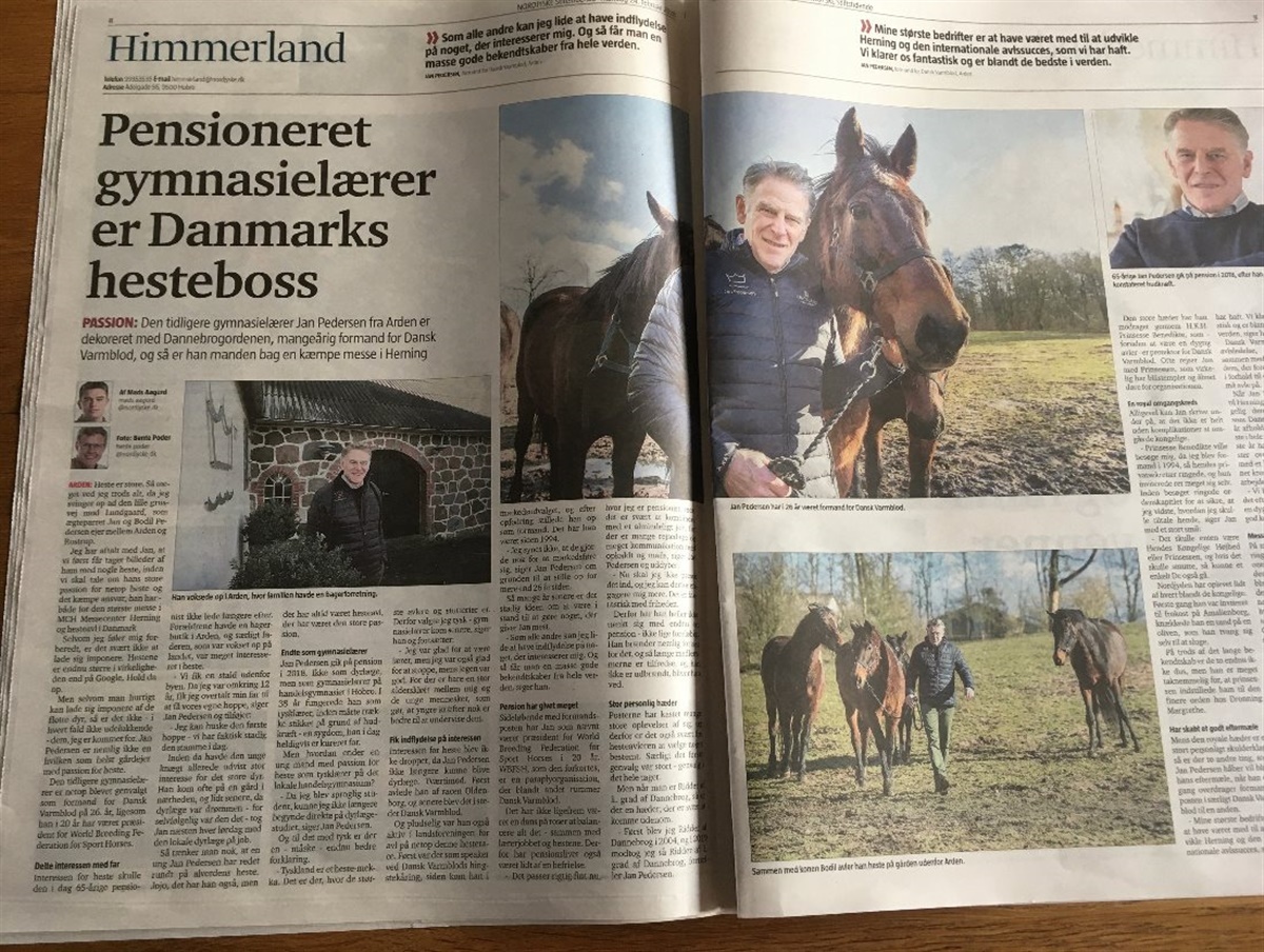 I dagens udgave af Nordjyske Stiftsstidende finder man en flot dobbeltsidet artikel om Jan Pedersen under overskriften "Pensioneret gymnasielærer er Danmarks hesteboss". Den 65-årige himmerlænding kendes af mange i hesteverdenen som Dansk Varmblods formand igennem 26 år og som en af hovedkræfterne i dansk og international hesteavl på forskellige platforme. Jan Pedersen, der selv har avlet rideheste i over 40 år, er også igennem to årtier præsident for den internationale paraplyorganisation World Breeding Federation for Sport Horses (WBFSH), lige som han igennem sit virke i Dansk Varmblod har været en af de store drivkræfter bag hingstekåringen i Herning i mange år.