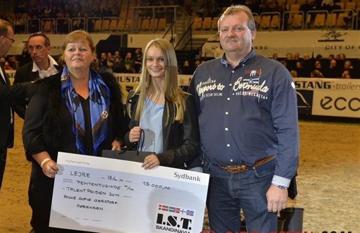 I år var det pony/junior-rytter Anne Sophie Gerstorf Sørensen, der havde gjort sig særlig positivt bemærket og derfor fik tildelt den flotte pris. Anne Sophie er blot 14 år, men hun udvikler sit talent med stormskridt. Hun er Dansk Ride Forbunds mester i kat II på Jumanji, der stadigvæk ejes af sin tidligere rytter, norske Ingrid Rimstad,og de blev Nordisk Mester for både hold og individuelt i Kristiansand, Norge. Og Anne Sophie kom på skamlen to gange ved DM i år, fordi da kat. 1 ponyernes kür-finale var afsluttet havde hun redet sig op på en fantastisk flot tredjeplads på Klooster’s Eltino. Det sluttede ikke her, for ved Dansk Ride Forbunds mesterskab for juniorer den følgende weekend vandt hun sølv på Finale.