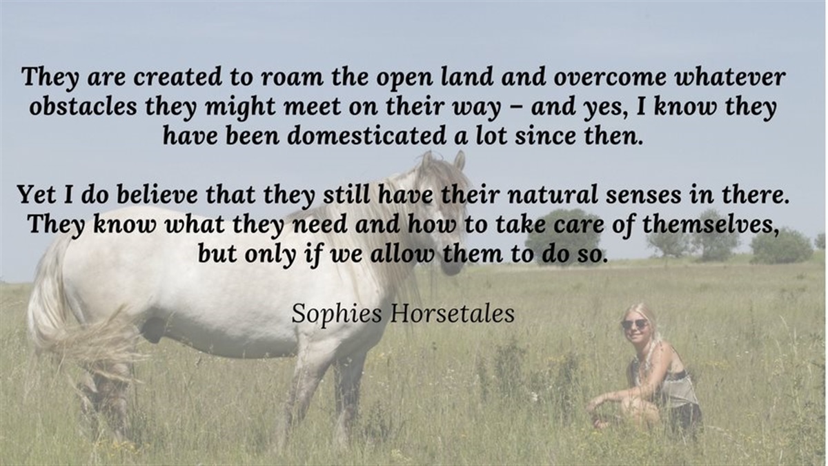 “Naturen er en del af friheden. Det er sjældent, at jeg har oplevet at være sammen med heste i noget som for alvor er naturligt. Vi har det med at indramme situationerne og tilrettelægge virkeligheden, som vi synes er passende. Fremfor bare at være til stede i naturen, som den er,” siger Sophie.